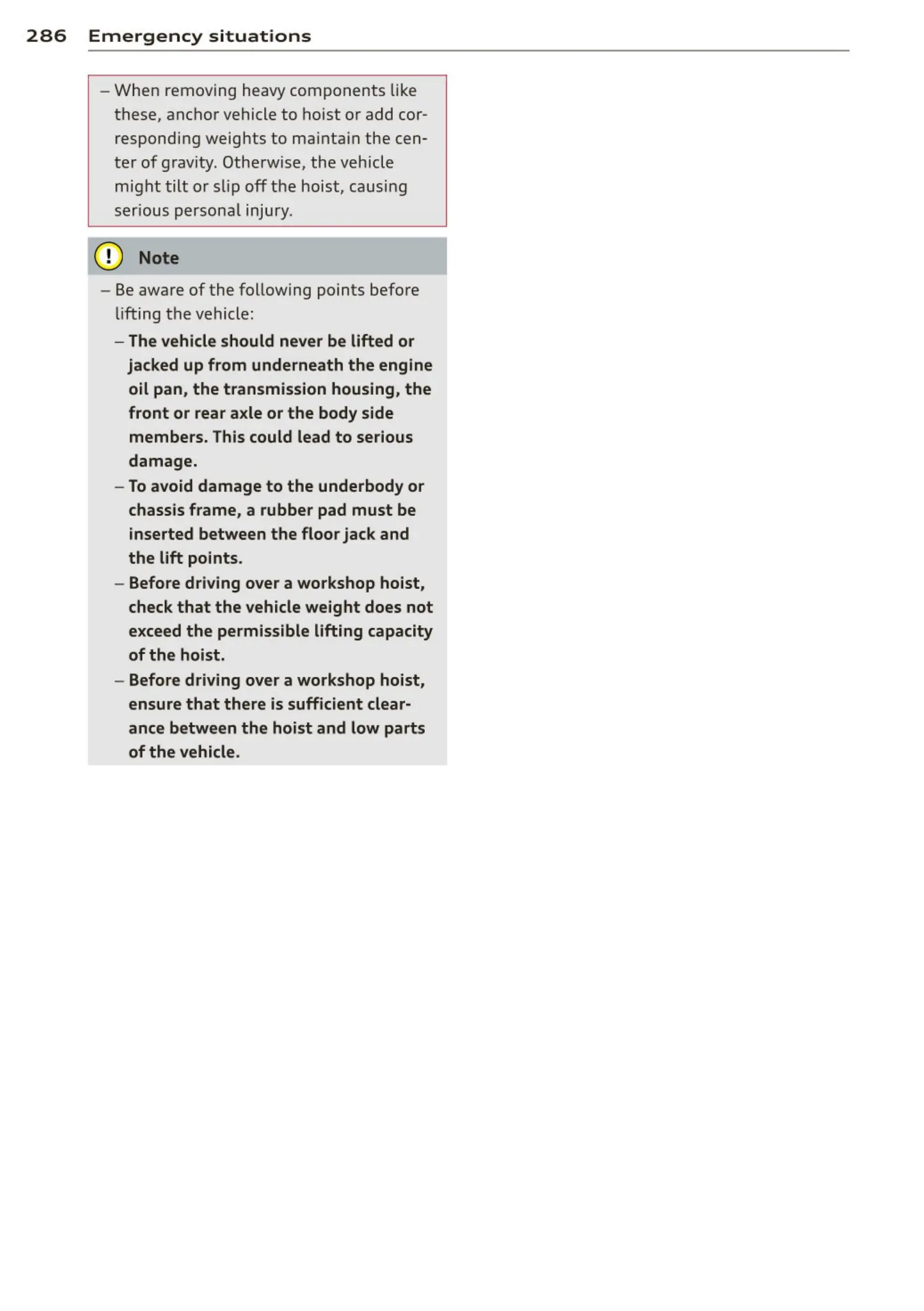 - Before driving over a workshop hoist,