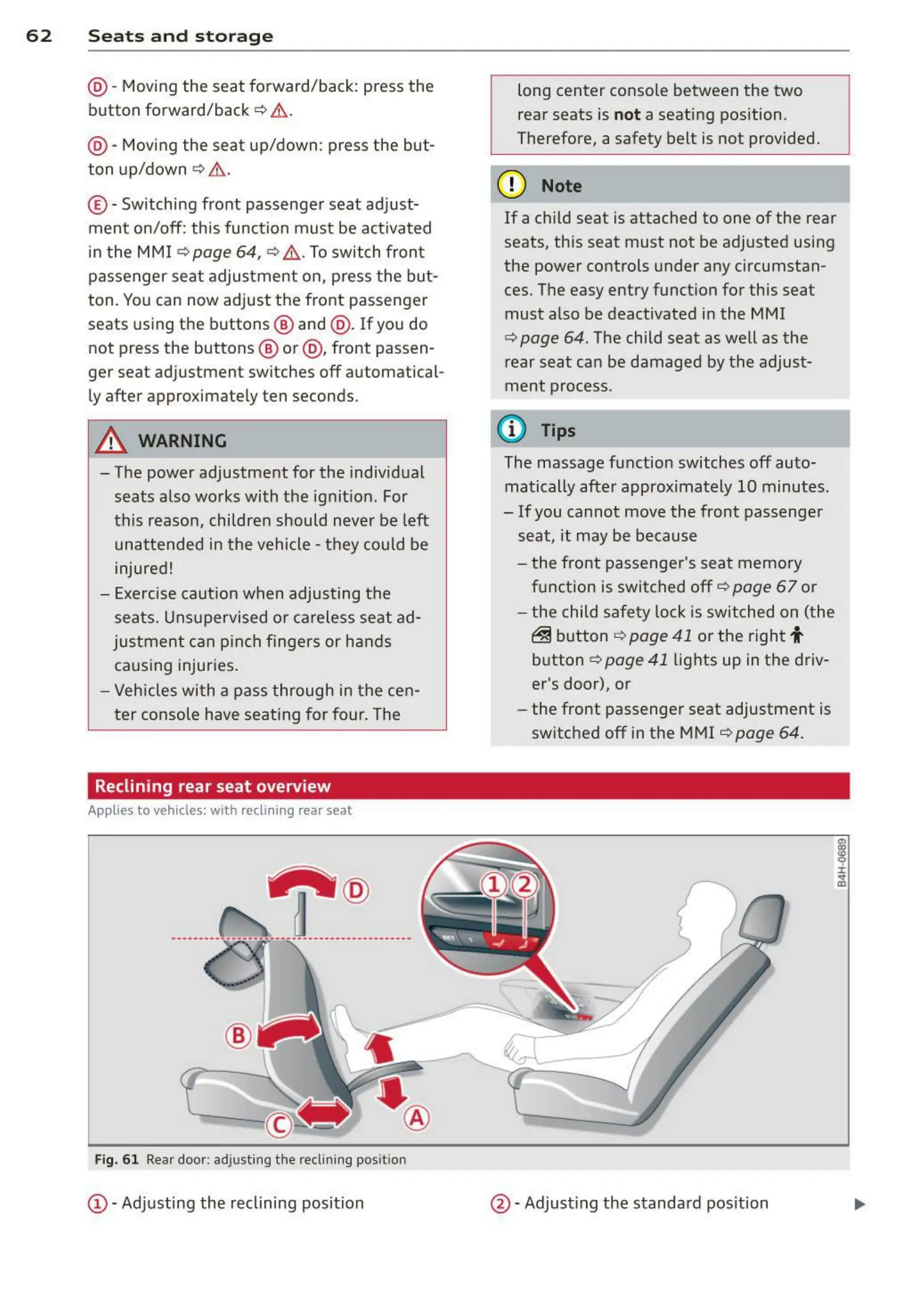 Fig. 61 Rear door : adju sting t he reclining posit ion