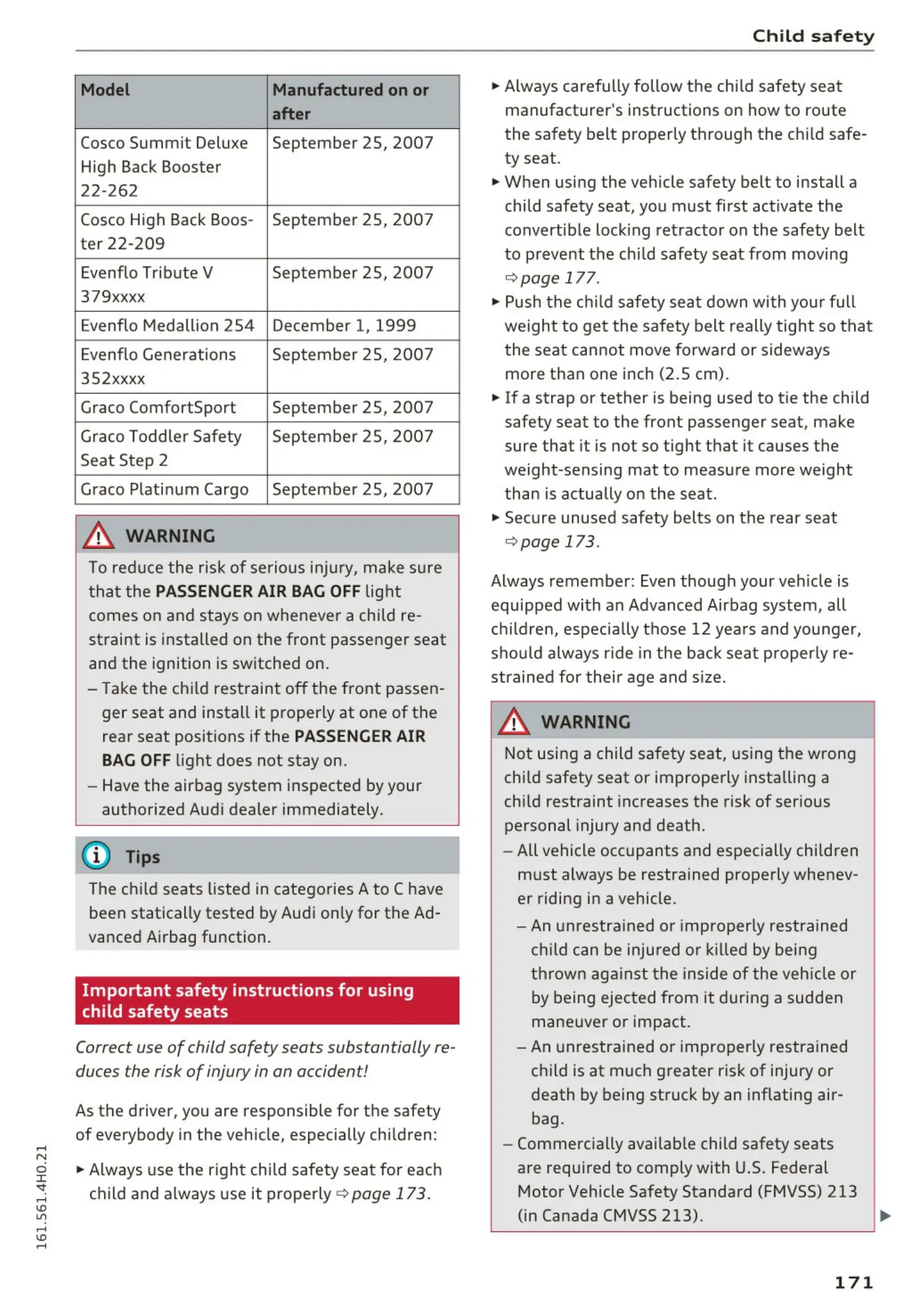 The chi ld seats listed in categories A to C have