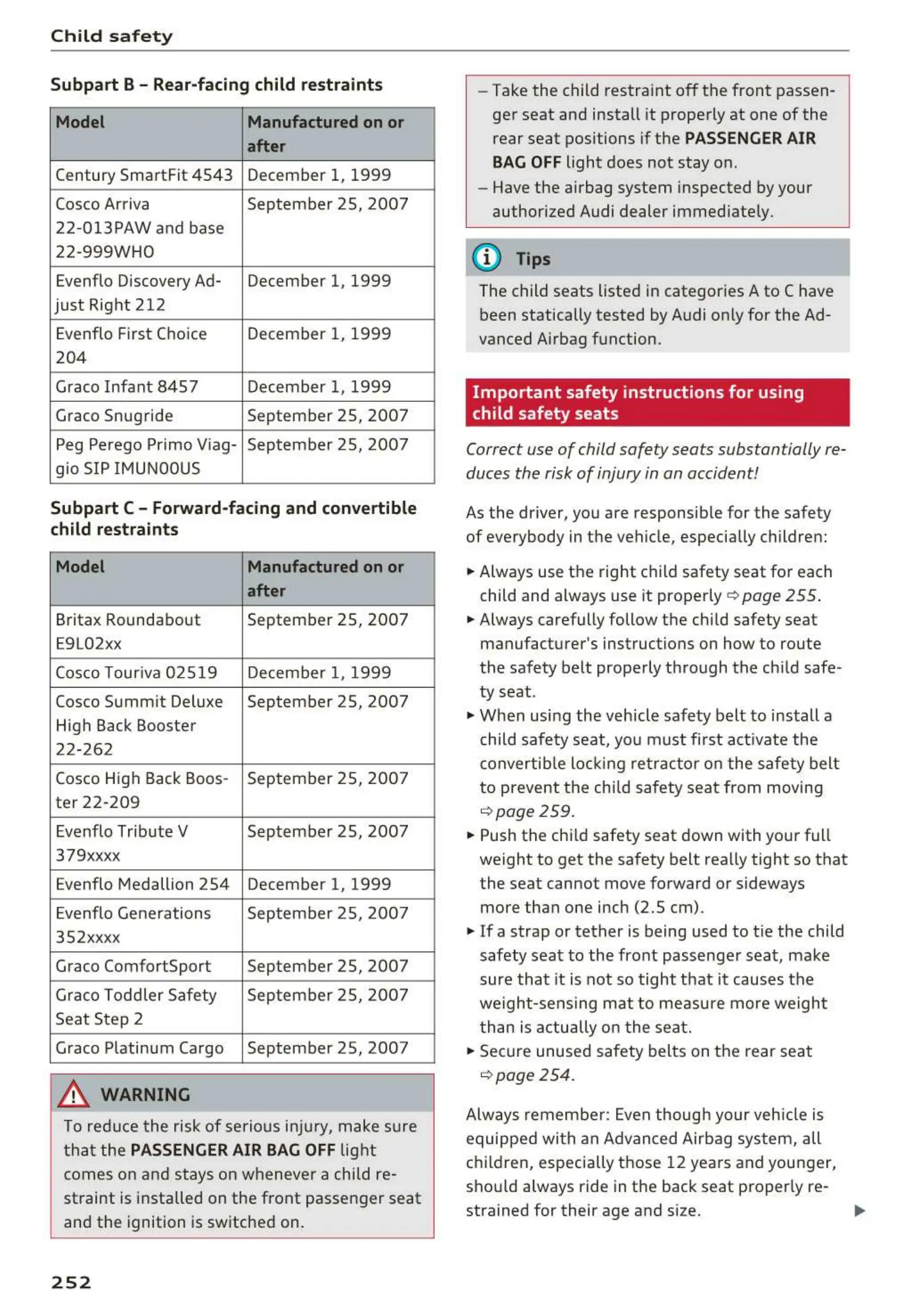 The child seats listed in categories A to C have