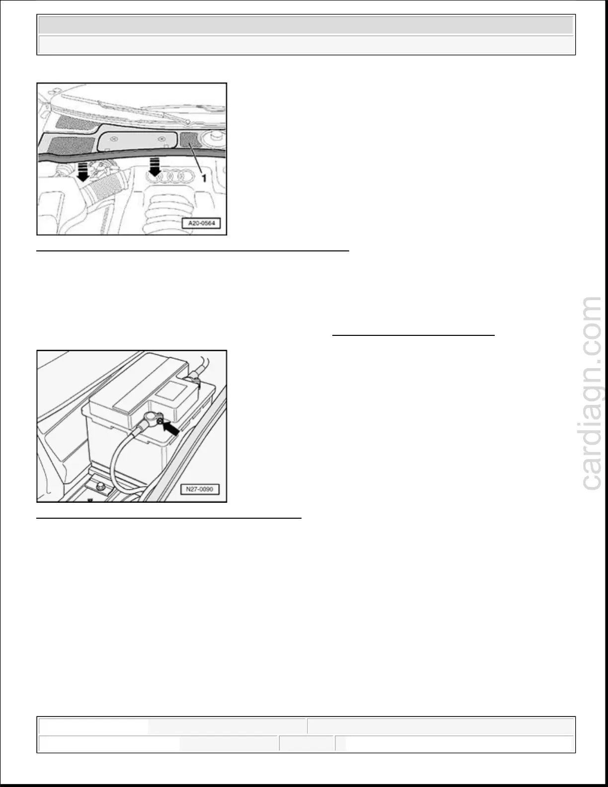 With ignition switched off, disconnect battery Ground strap - arrow -.