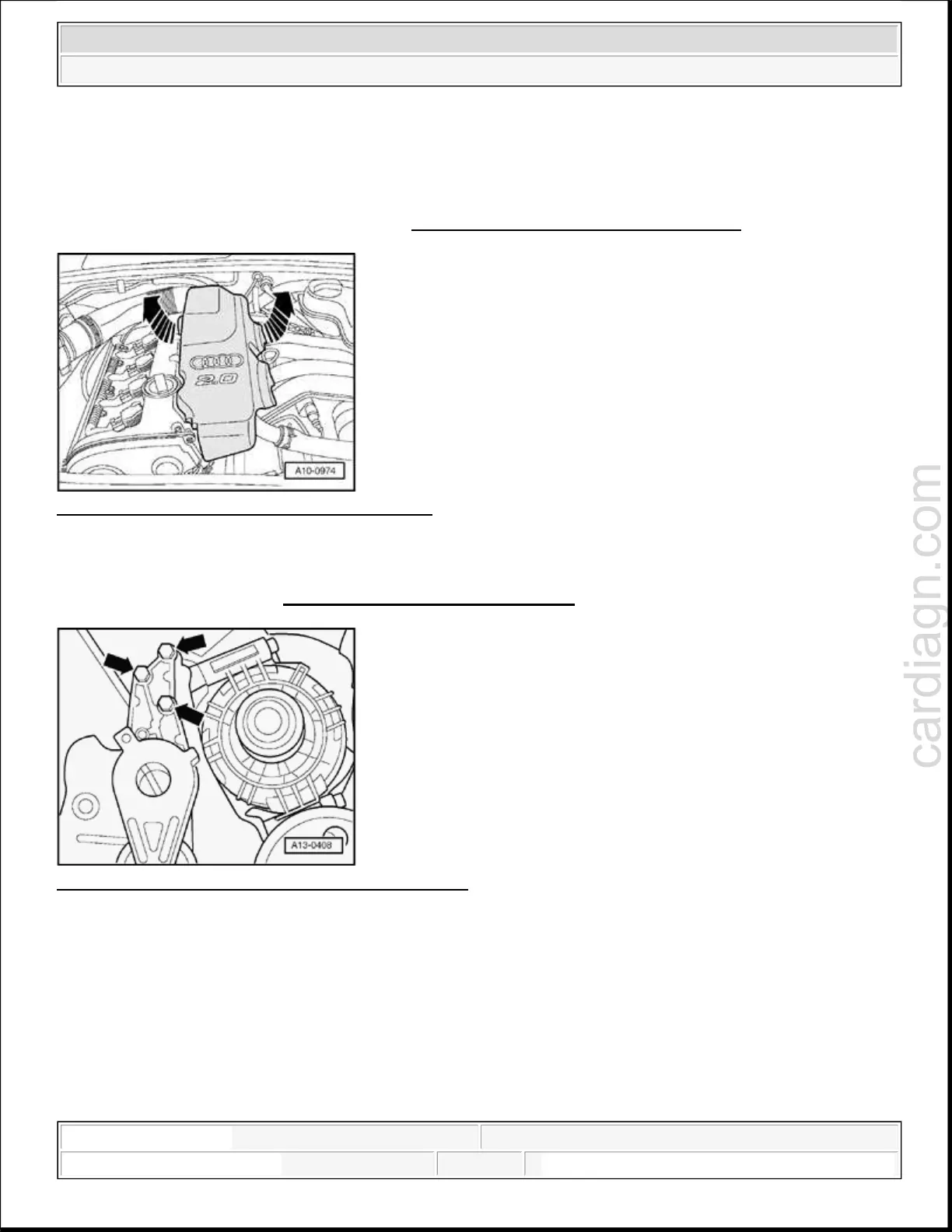 Remove engine cover by lifting up - arrows -.