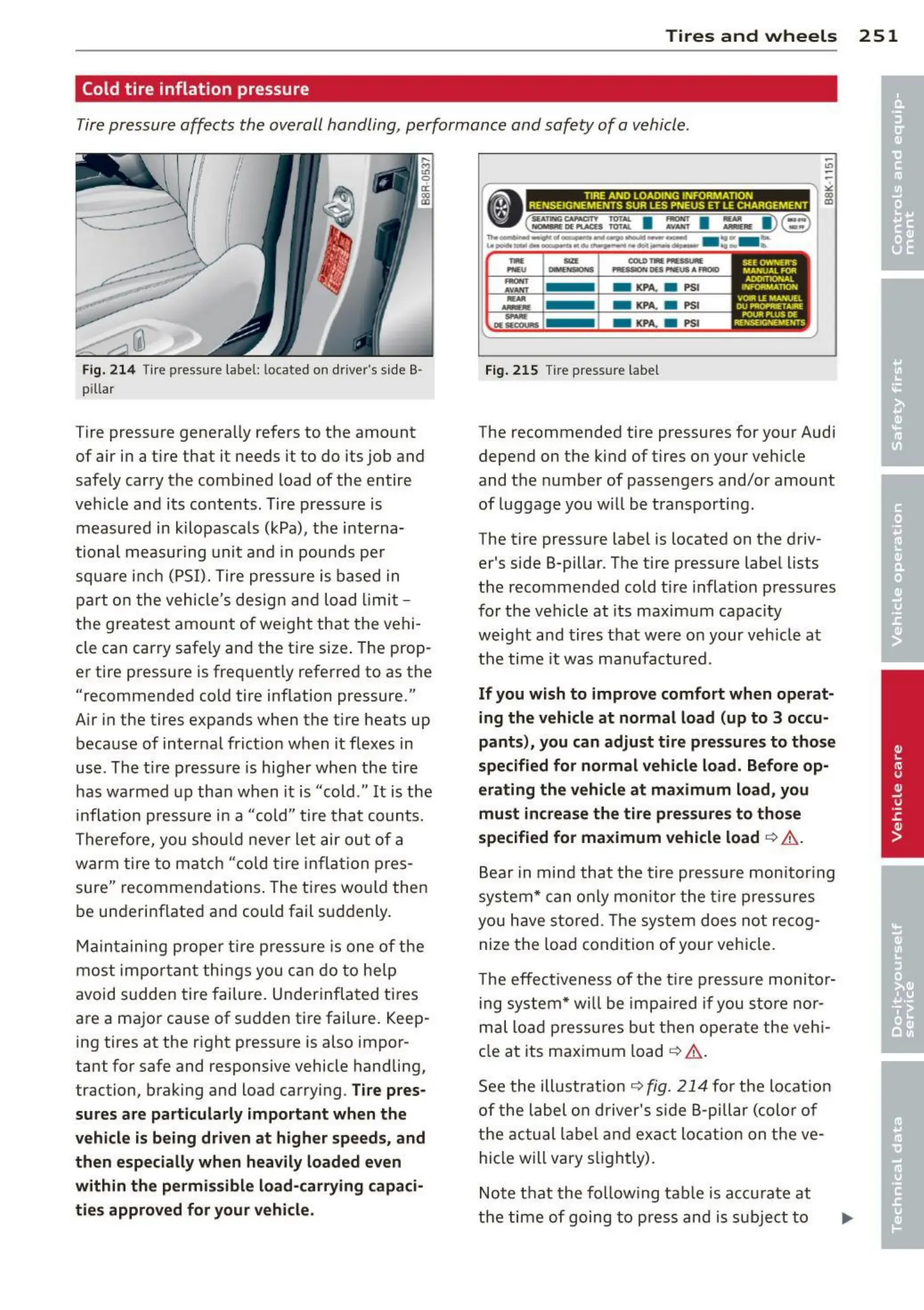 Fig. 214 Tire pressur e labe l: located on driver's side B·