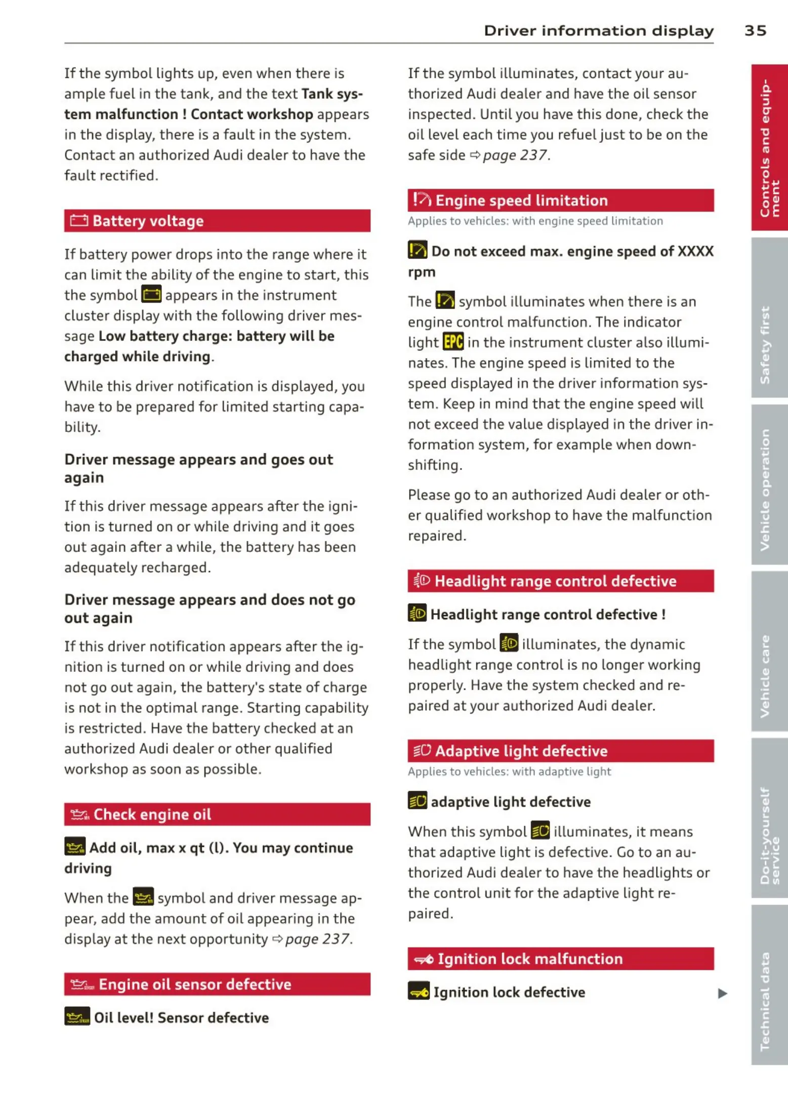 thorized Audi dea ler and have the oil sensor