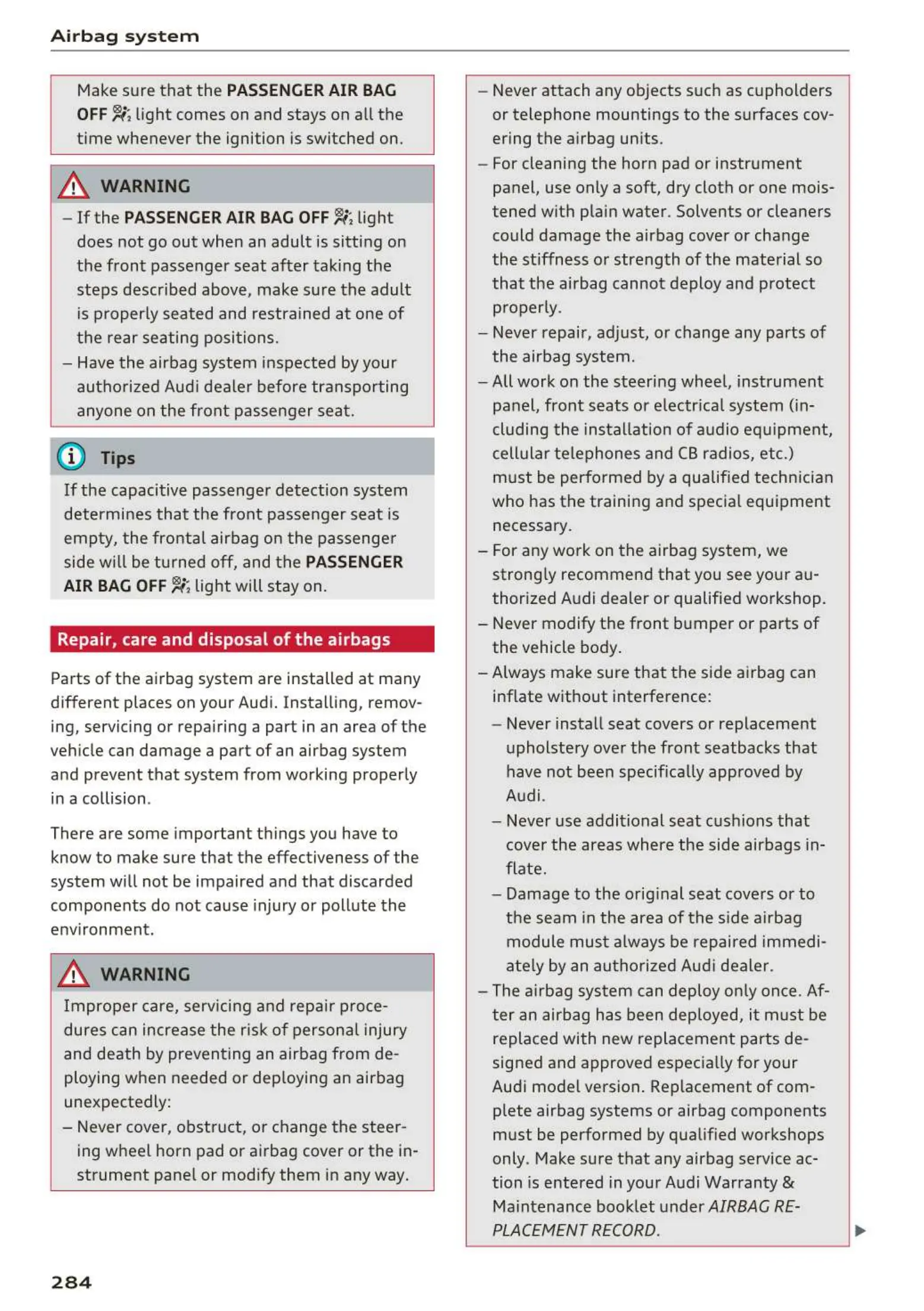 Repair, care and disposal of the airbags