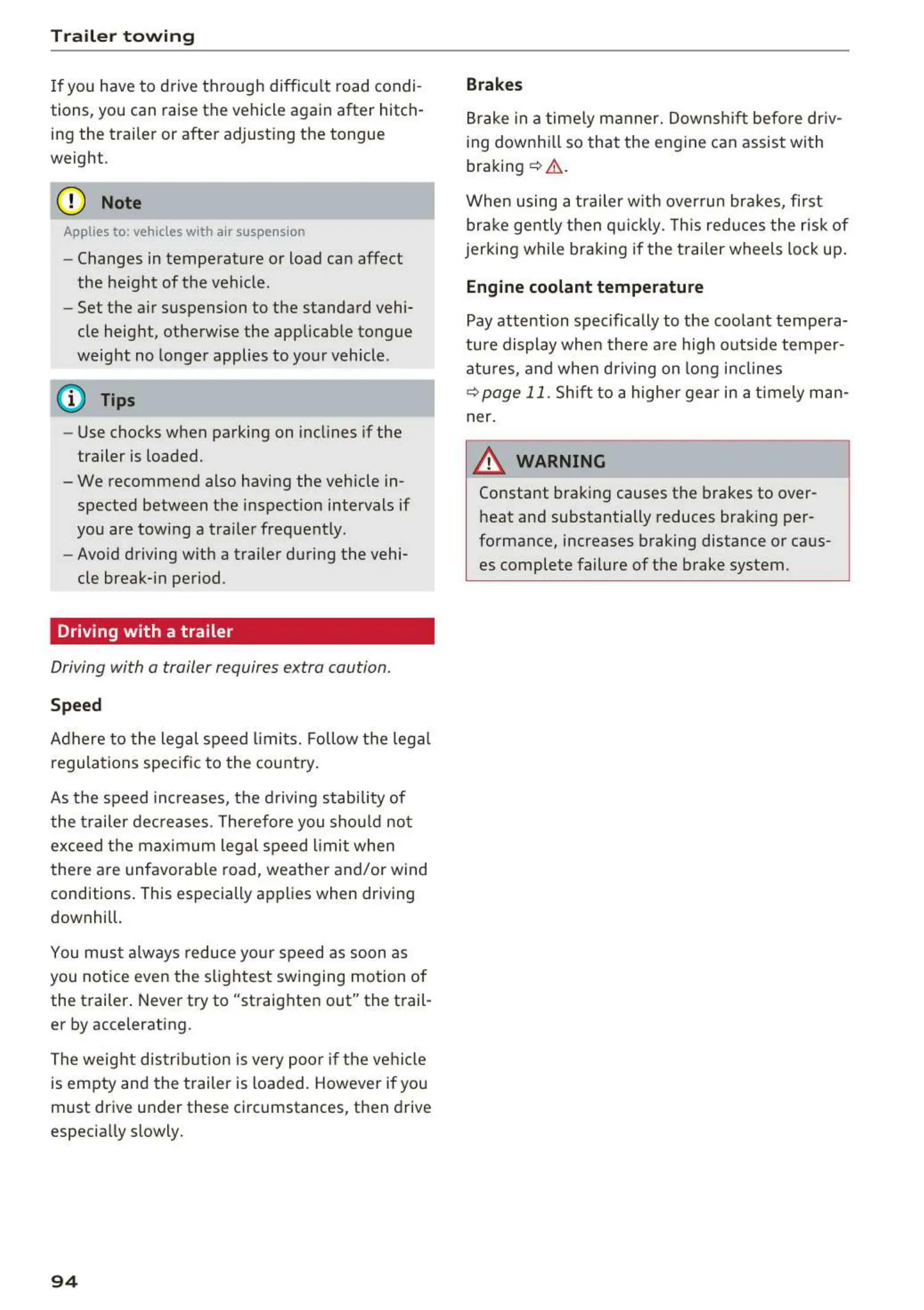 When using a t railer w it h over run bra kes, fi rst