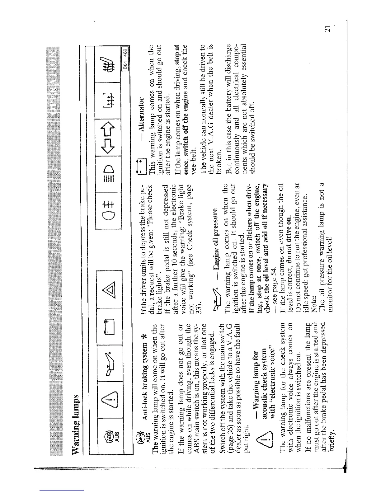 Audi QUATTRO - Vehicle Operation Switches; Warning Lamps; ABS and acoustic check system; Engine oil pressure and alternator warnings