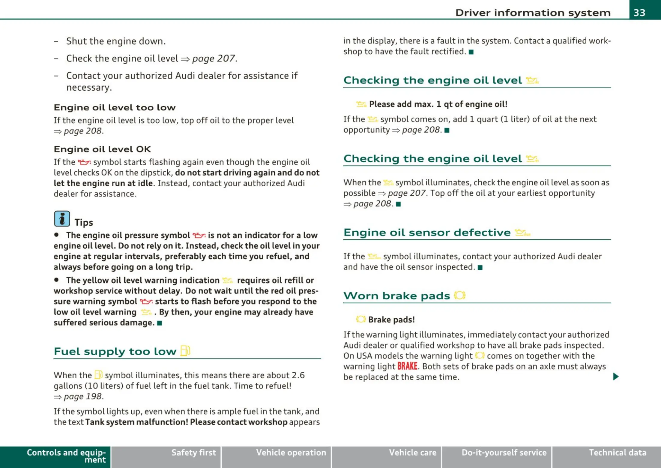 Audi dealer or qualified workshop to have all brake pads inspec t ed .