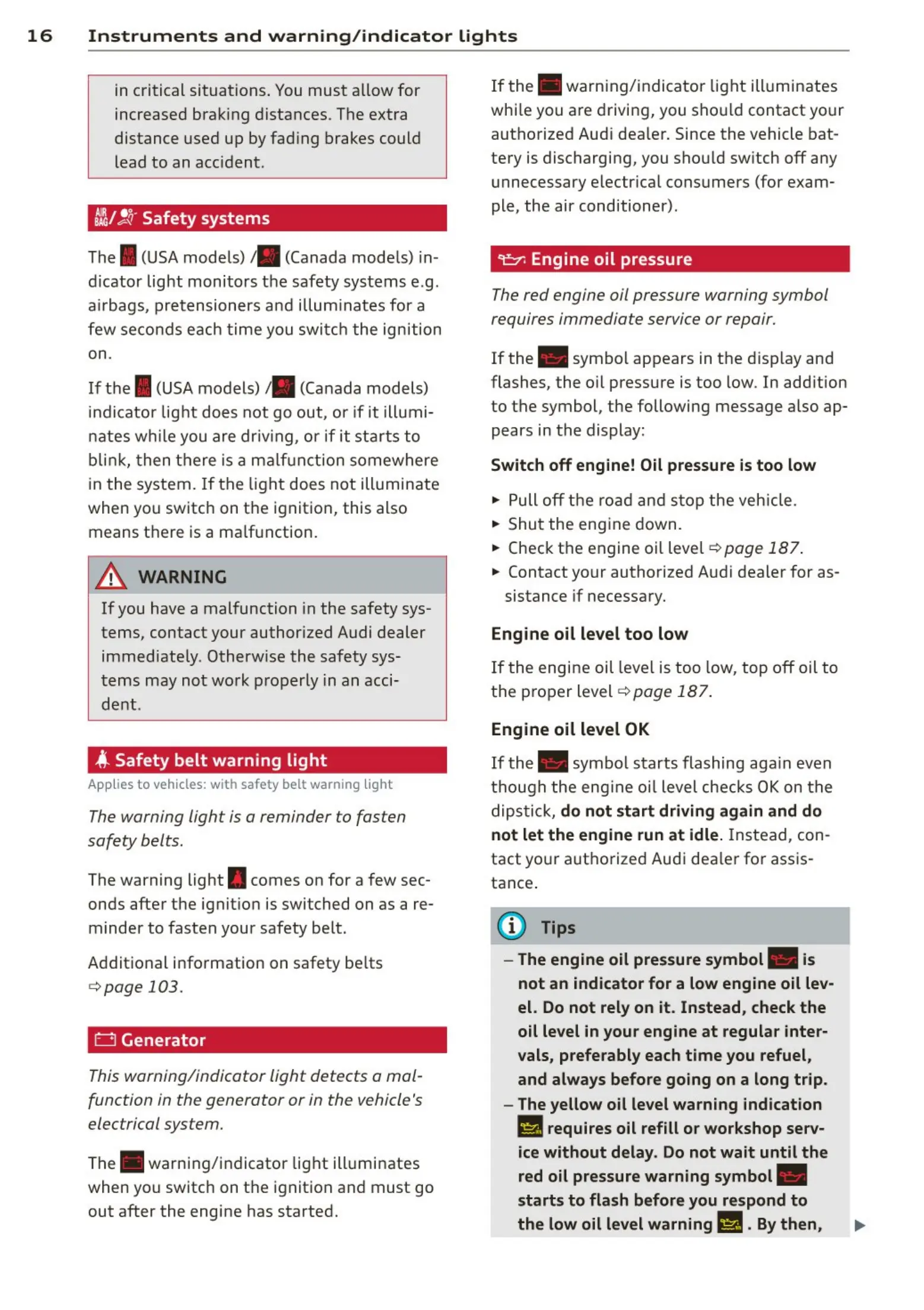 16 In s trum e nt s and w a rn ing /i ndic at o r light s