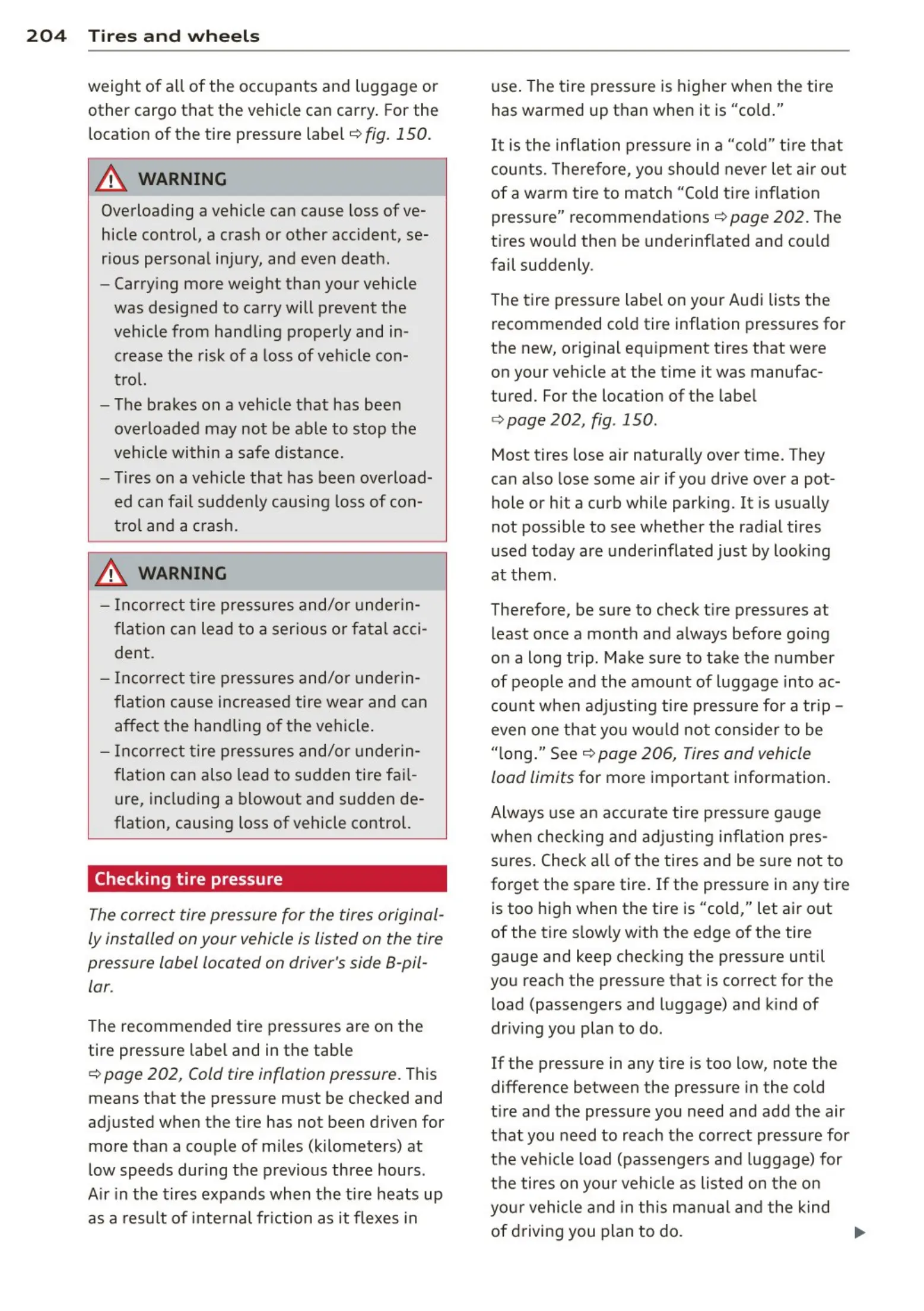 ¢ page 202, Cold tire inflation pressure . This