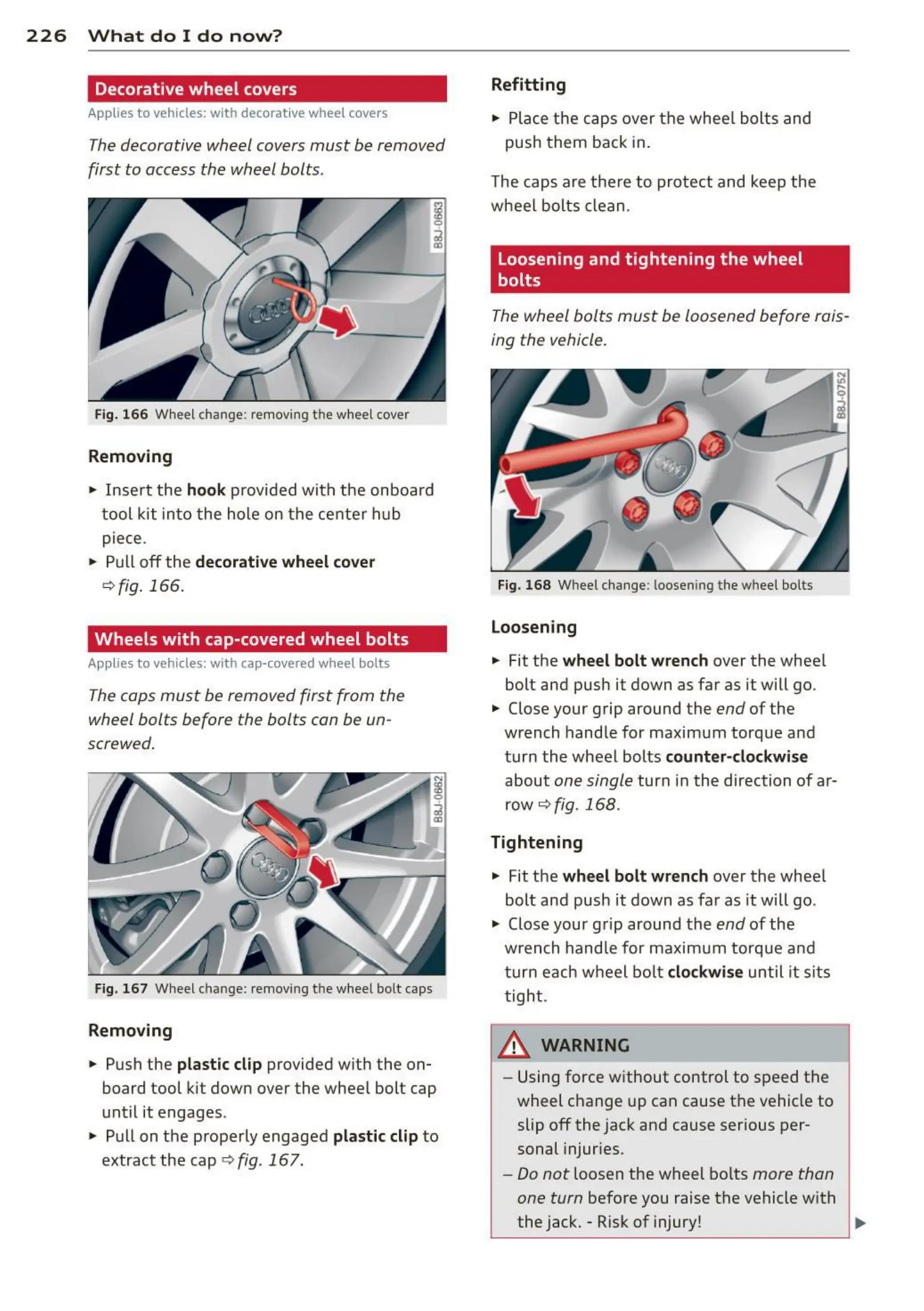 Fig. 167 Wheel change : removing t he whee l bo lt caps
