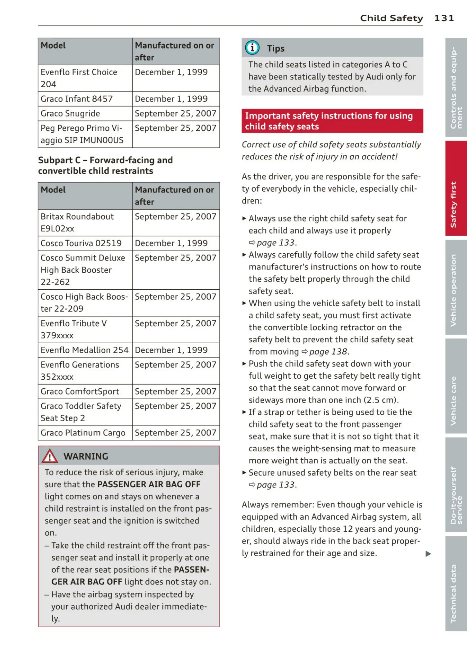 The child seats listed in categories A to C
