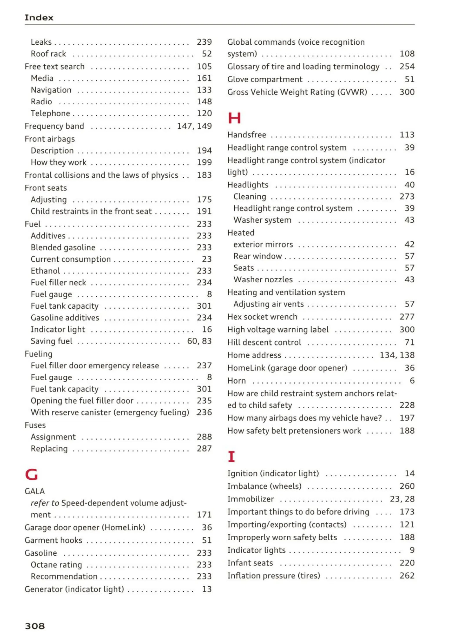 Inflation pressure (tires) . . . . . . . . . . . . . . . 262