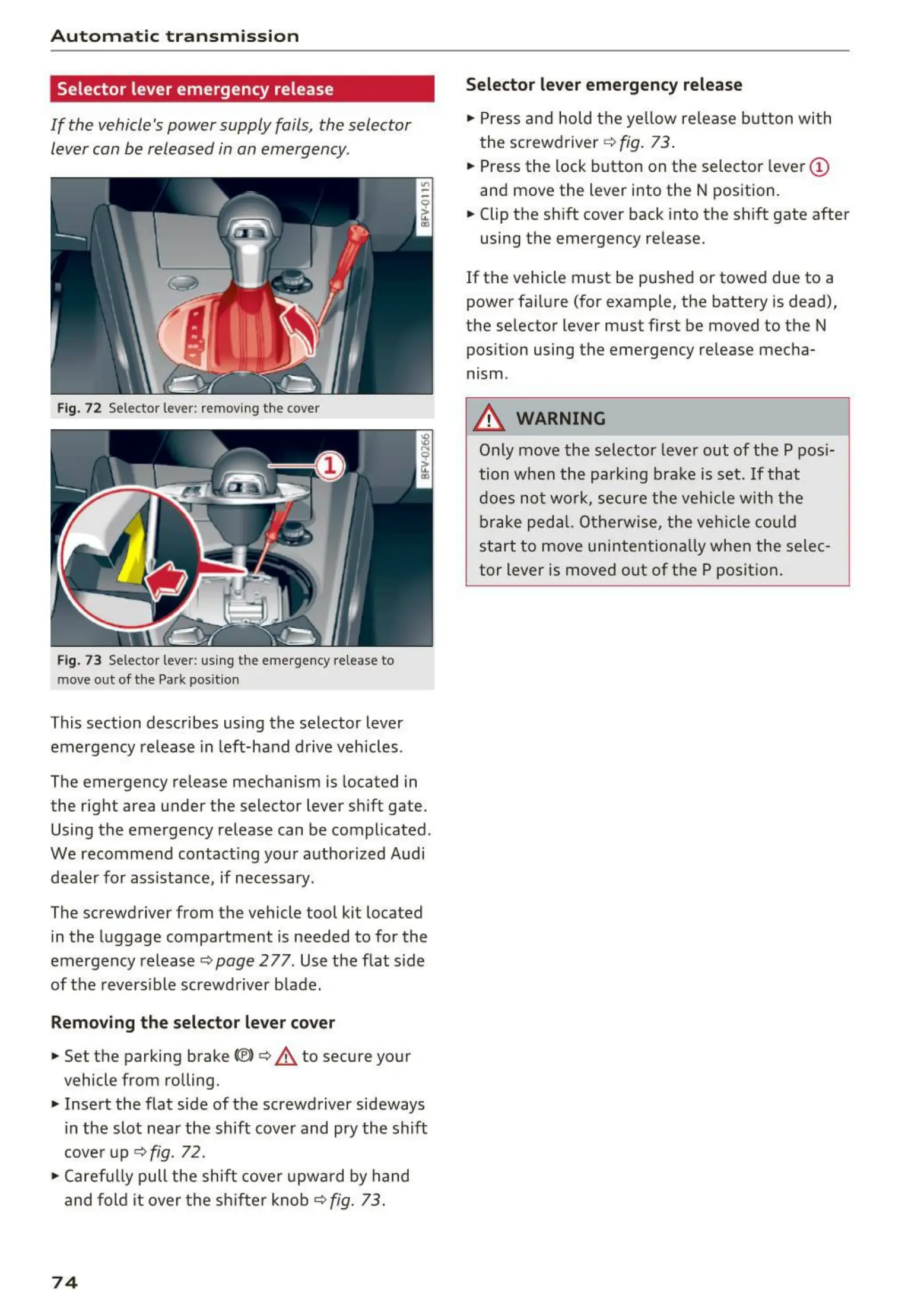 Fig. 73 Selector lever: using the eme rgency release to