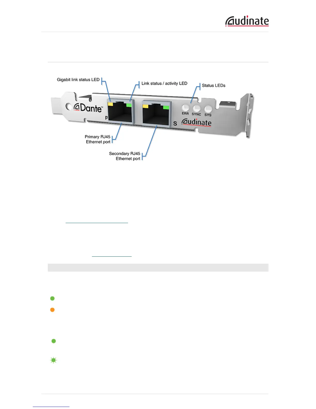 A solid green light indicates that the device is a Dante PTP clock slave and is synchronized to the