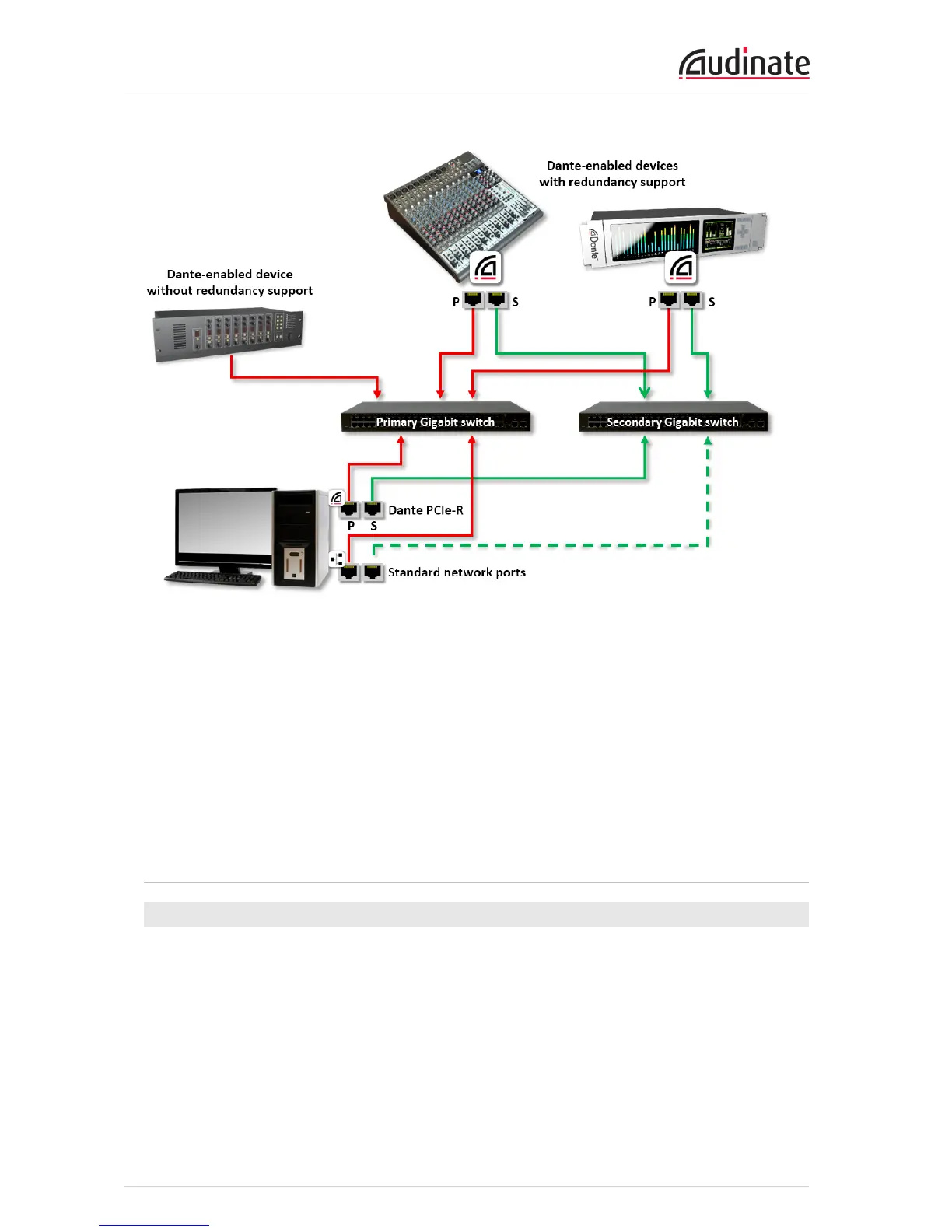 3. Connect the primary Dante ports on each Dante device to the primary Gigabit switch.