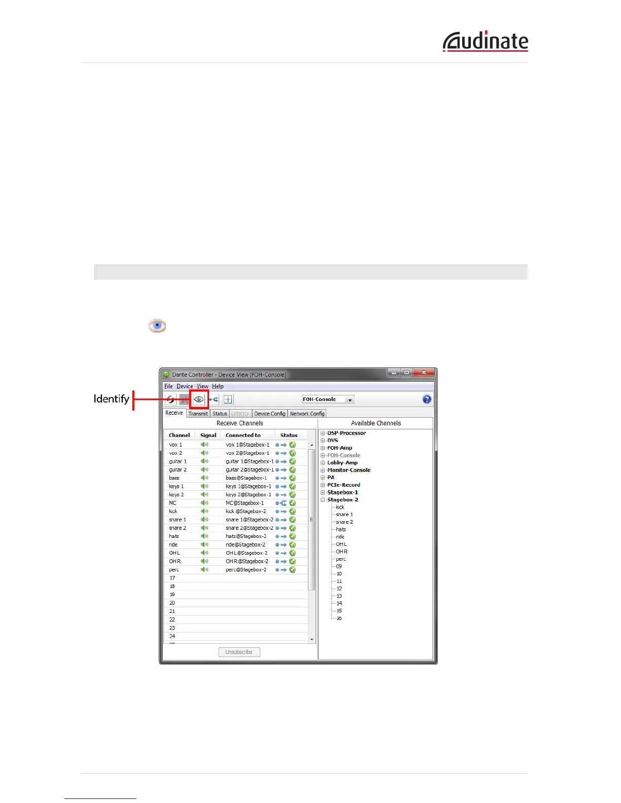 Identify icon in the Device View toolbar. This will cause all of the LEDs on the Dante PCIe-R to flash