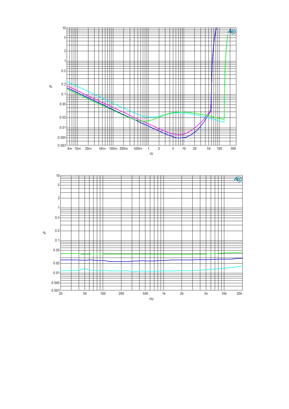 T.H.D + N gegen die Frequenz auf 8Ω Klasse A, 80 kHZ Messband (1W BLAUE Kurve, 10W HELLBLAUE Kurve und 40W GRÜNE