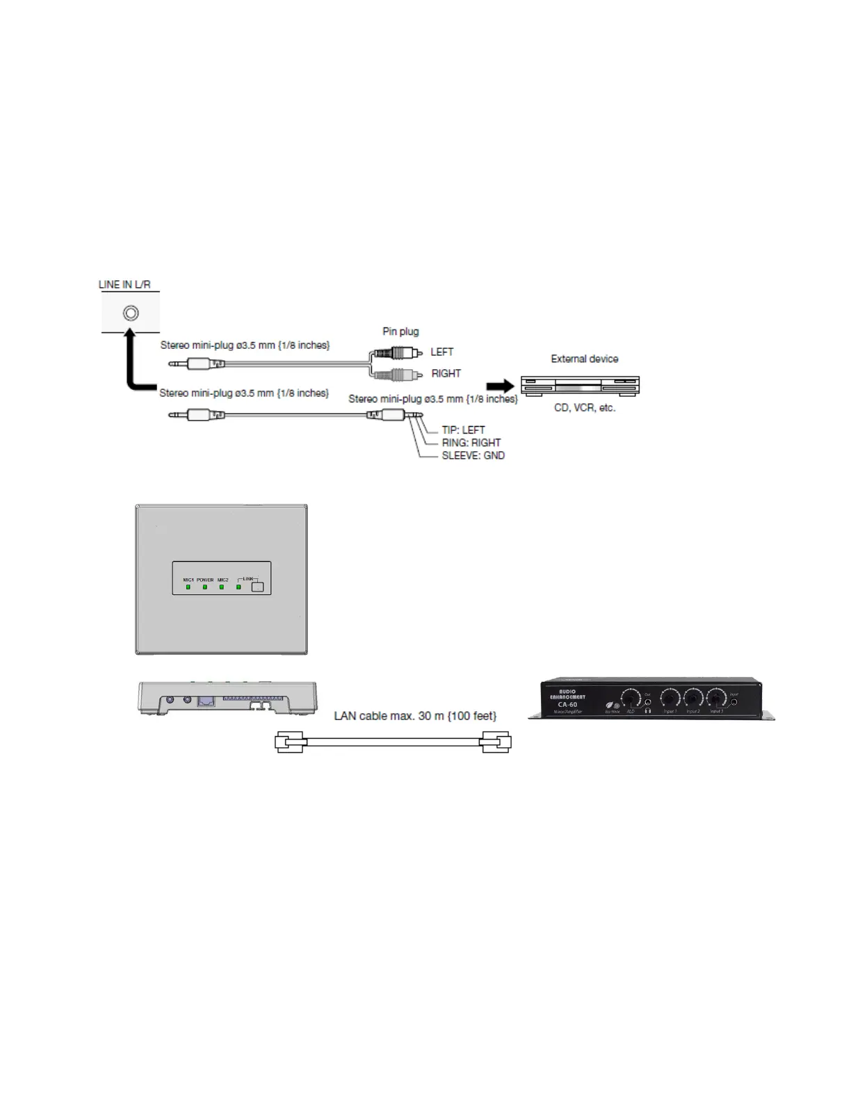 Connect the audio output of a projector, CD player or DVD/VCR or similar line level output to the LINE IN connector of this
