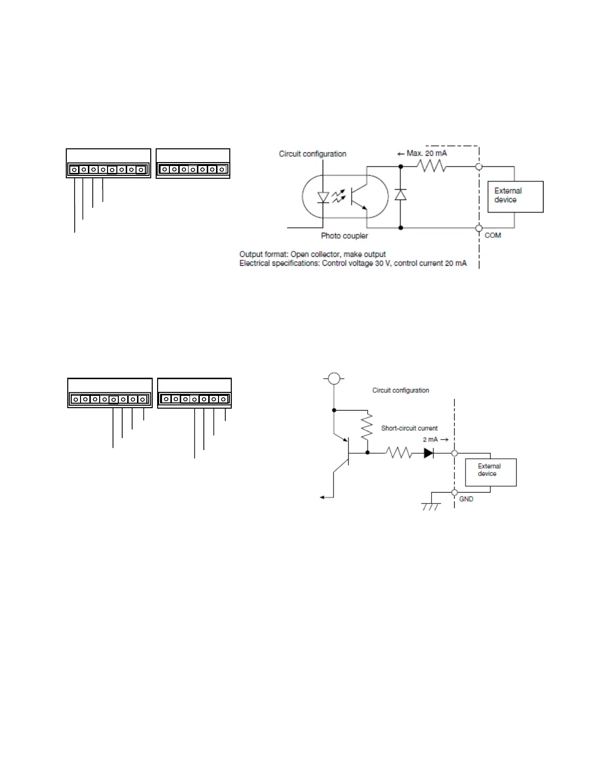 An external device is connected between each terminal and GND. These terminals operate by closing their circuits. The GND