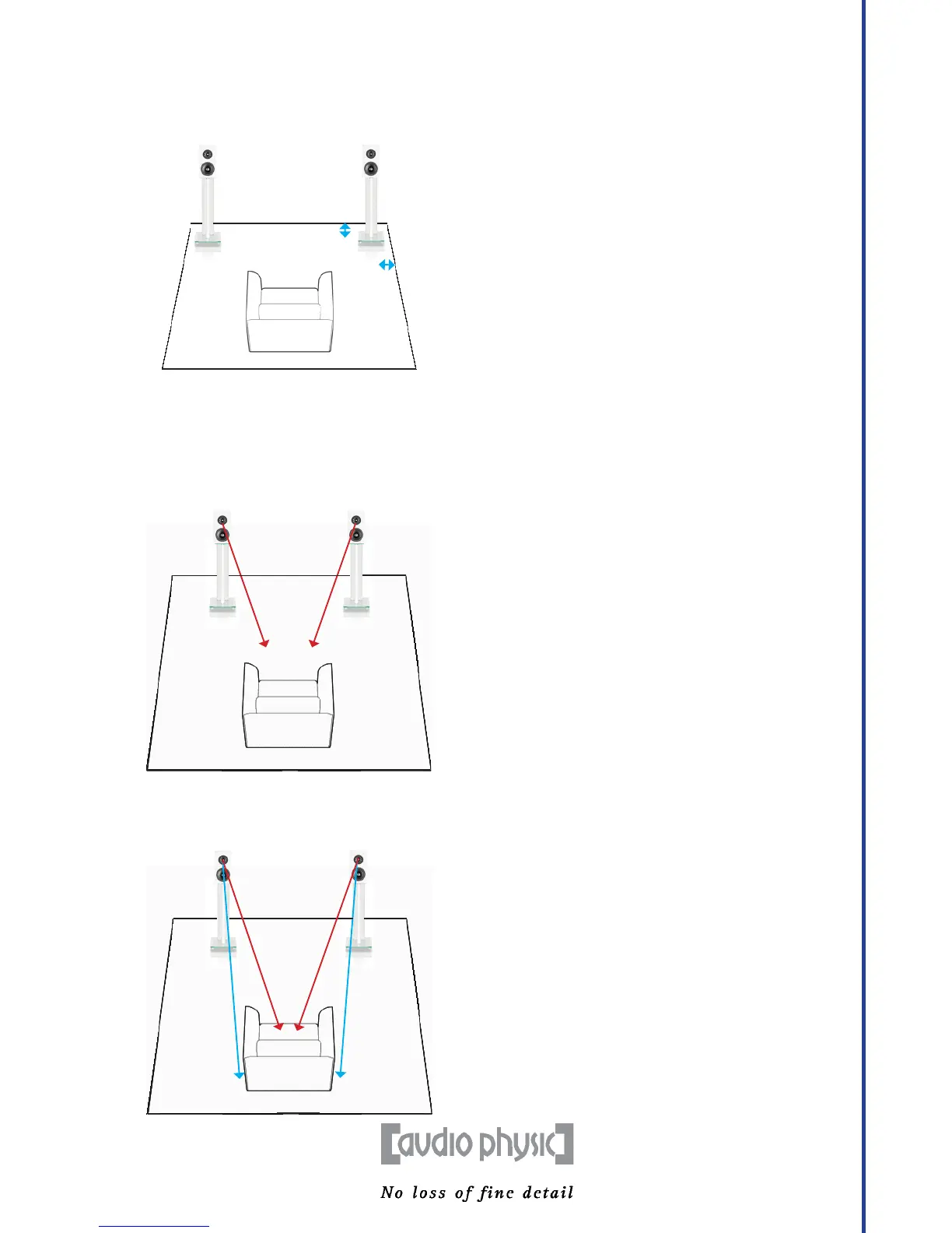 2. Mögen Sie eine breitere Bühne, winkeln Sie die Boxen weniger ein (blau). Ab einem bestimmten Winkel verliert