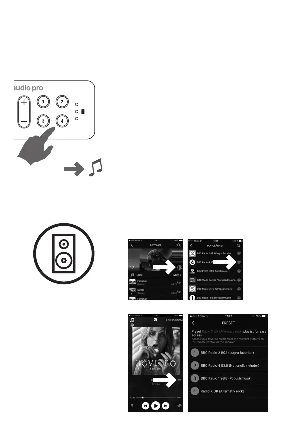 Spela innehåll via app. Håll ned preset knapp