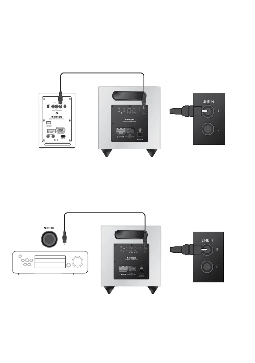 kytketyn kaiuttimen) sub out -liitäntään ja liitä johto sitten RCA input -liitäntään OIKEALLE (R tulo, punainen).