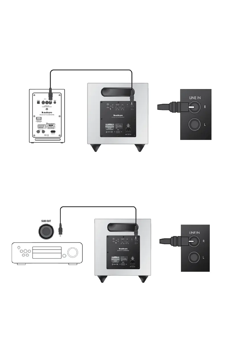 lare som har Sub Out utgång), anslut sedan kabeln till RCA ingången på Addon Sub. Anslut till R ingång (R input,