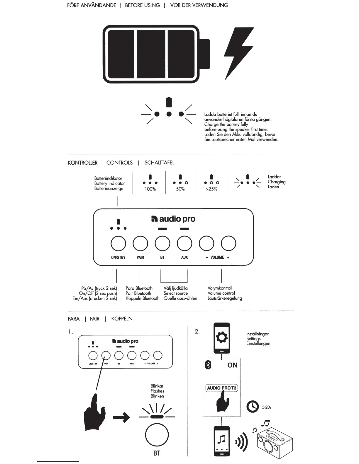Audio Pro ADDON T3 - Controls Overview; Battery Status and Charging; Main Controls and Functions; Bluetooth Pairing Procedure