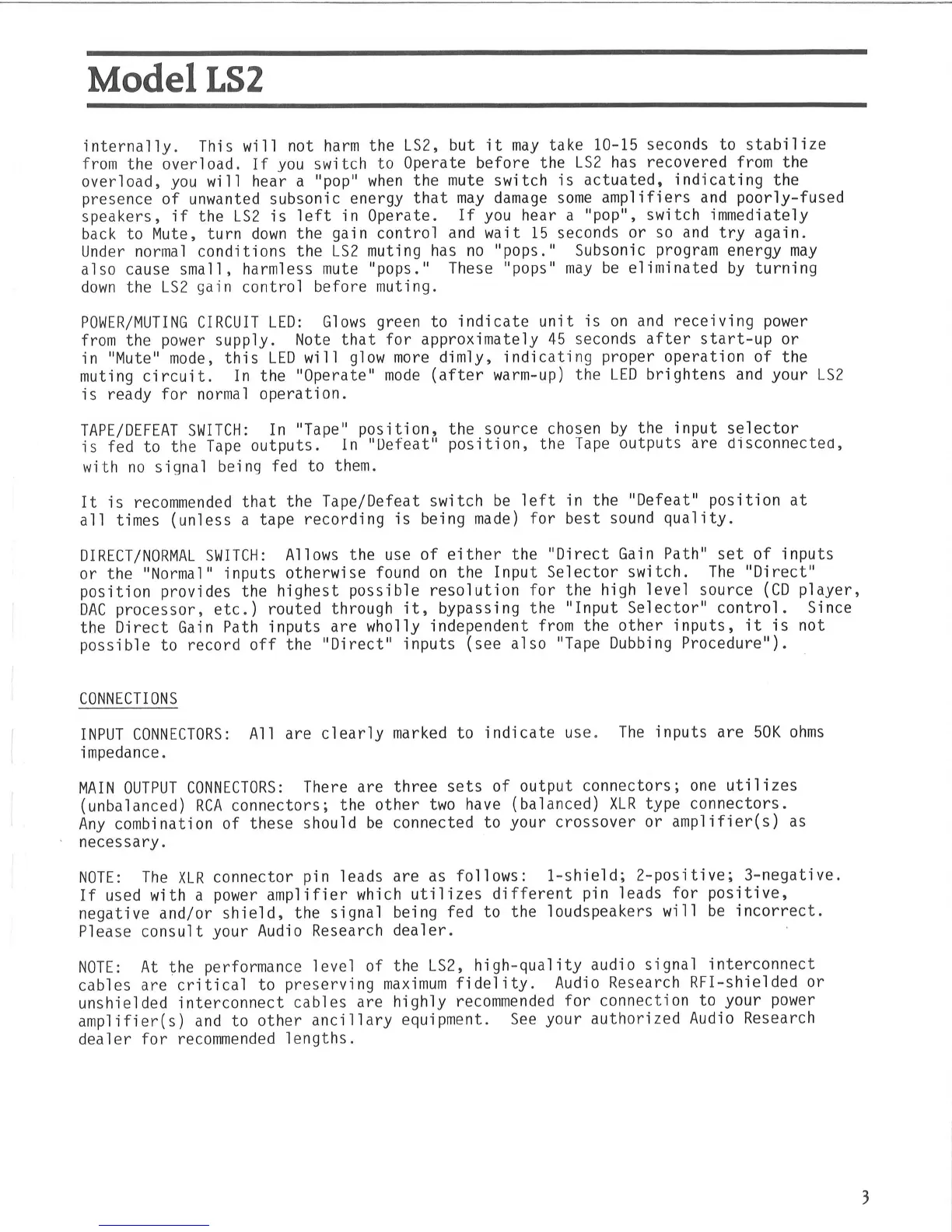 Audio Research LS2 - Audio Connections; Input and Main Output Connectors
