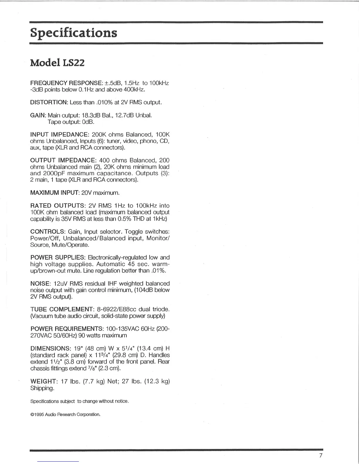 Audio Research LS22 - Technical Specifications; Performance Specifications; Operational and Power Specs