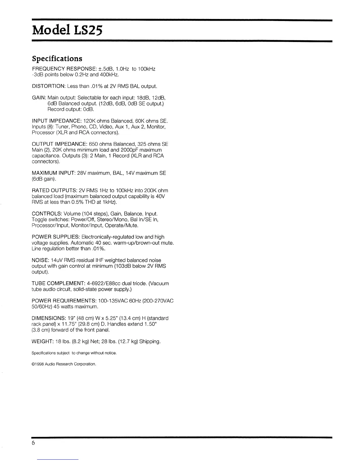 Audio Research LS25 - Technical Specifications; Key Specifications List