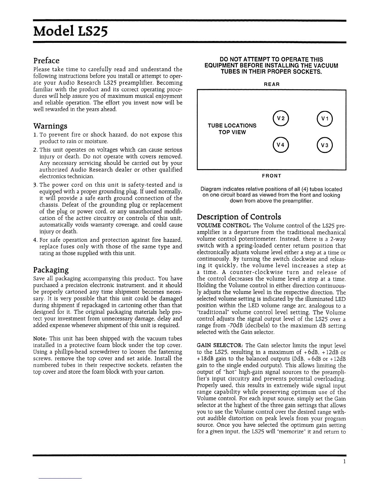 Audio Research LS25 - Preface; Safety and Handling; Warnings and Precautions; Packaging Guidelines
