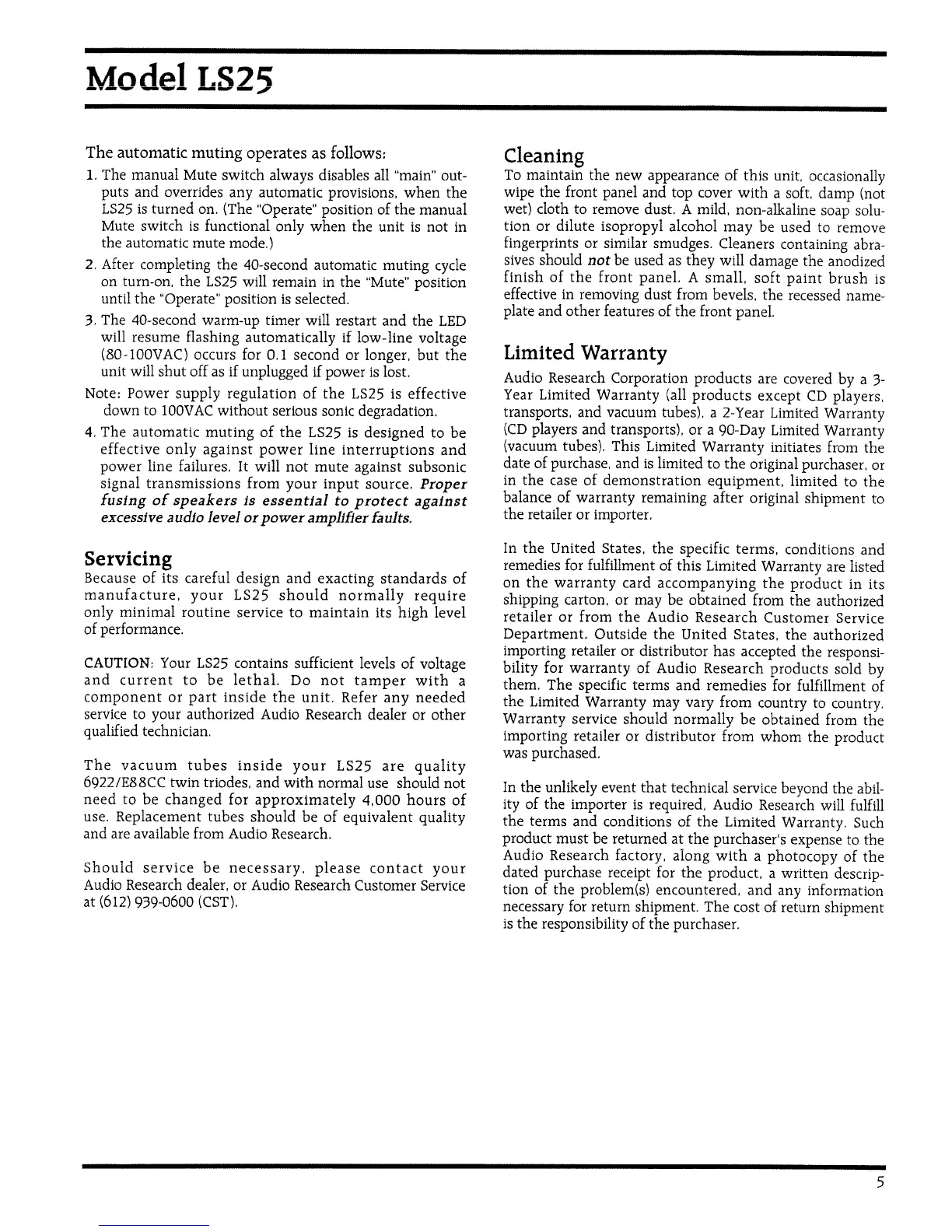 Audio Research LS25 - Servicing and Maintenance; Routine Maintenance and Tube Replacement; Cleaning and Warranty Information