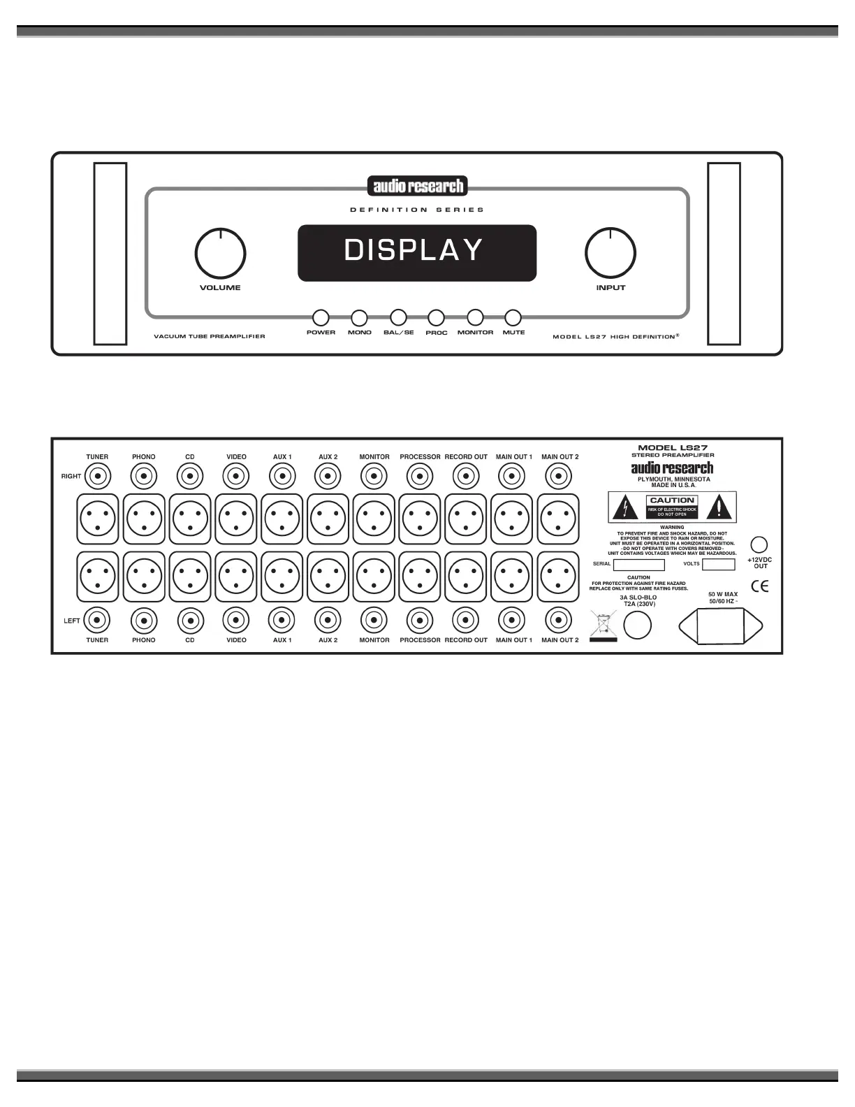 Audio Research LS27 - System Layout and Connections; Front Panel Controls Diagram; Rear Panel Input;Output Jacks; Safety Labels and Warnings