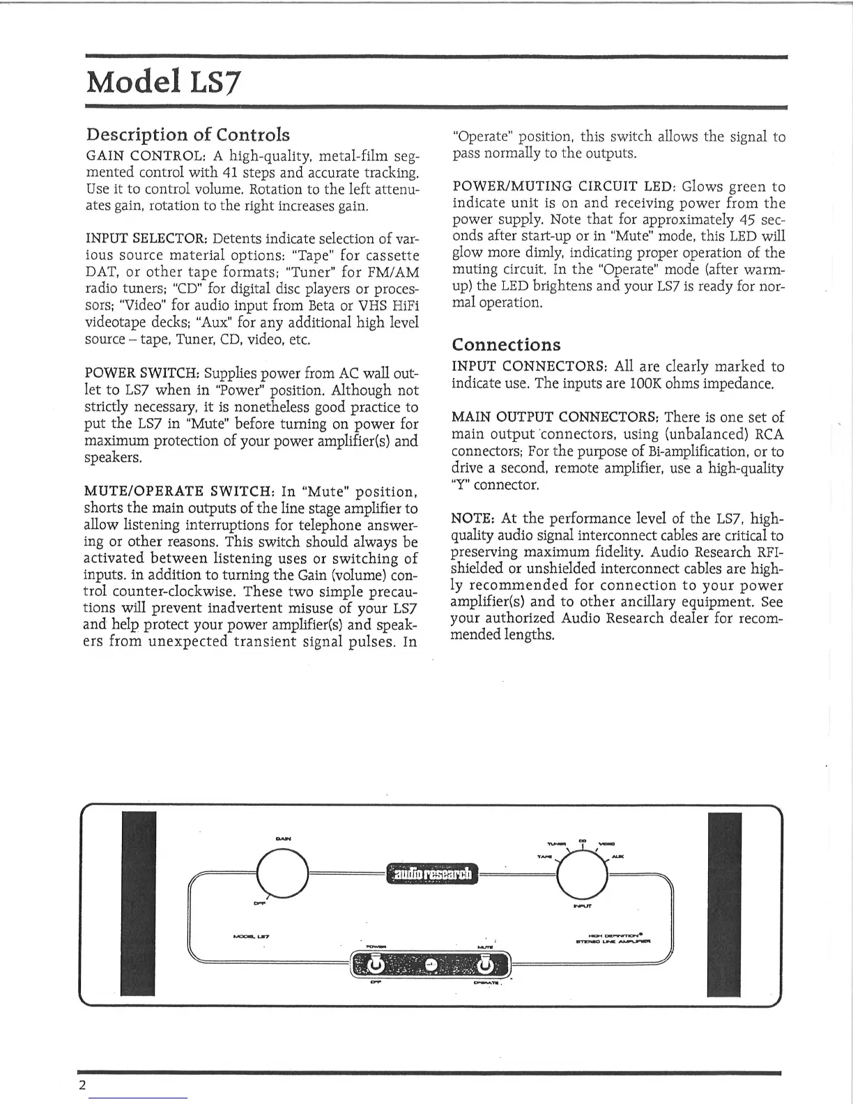 Audio Research LS7 - Front Panel Controls Explained; Input and Output Connections