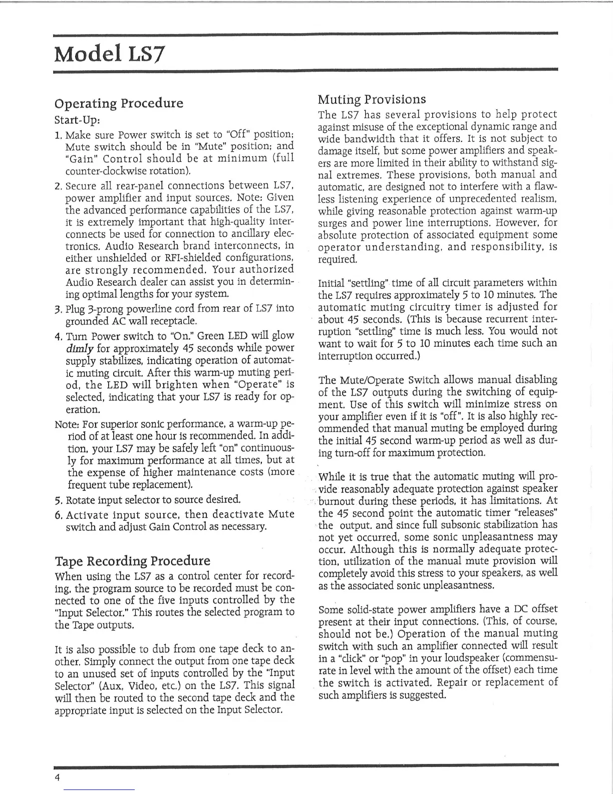 Audio Research LS7 - Operating Procedure and Muting Features; Tape Recording Functionality
