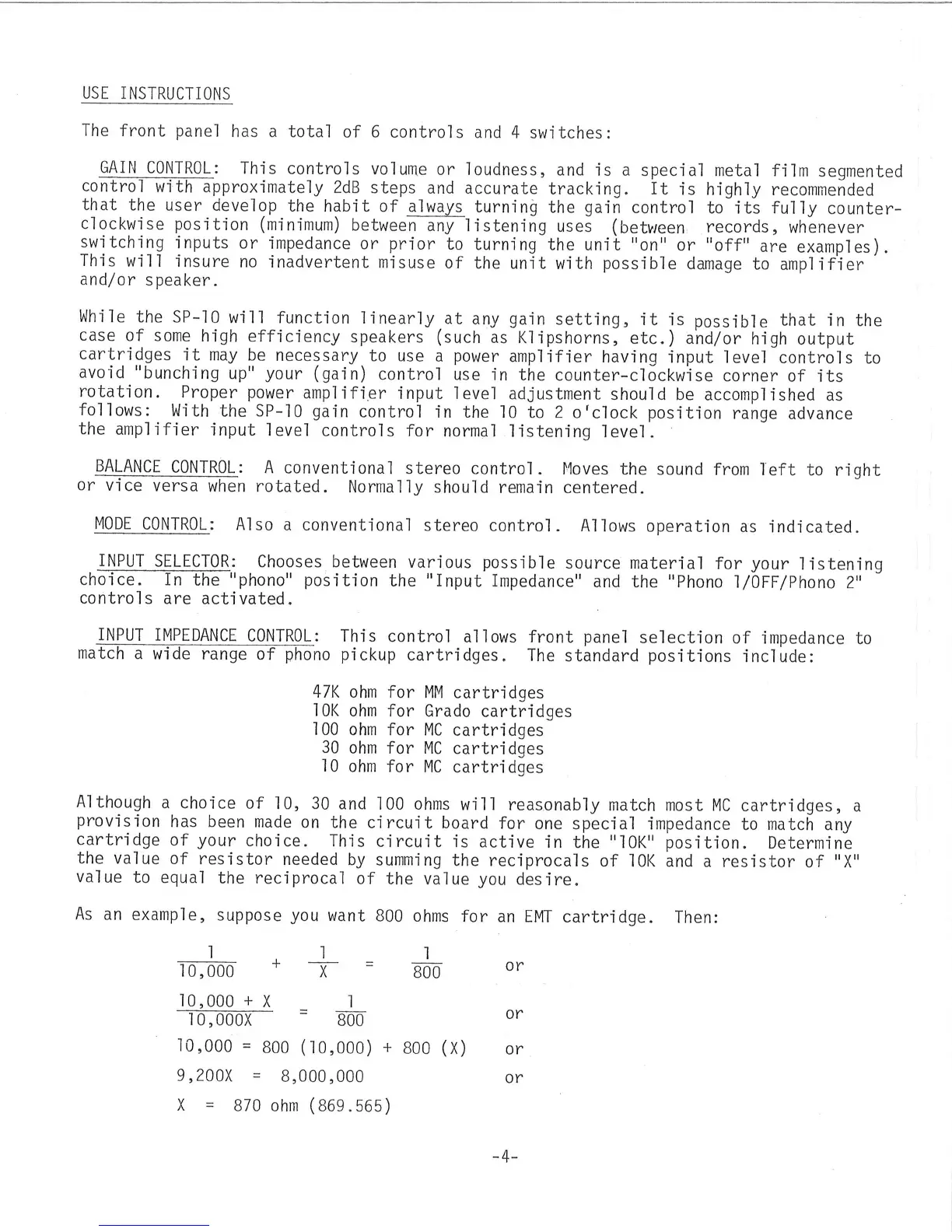 Audio Research SP10 - Use Instructions; Gain Control; Balance Control; Mode Control