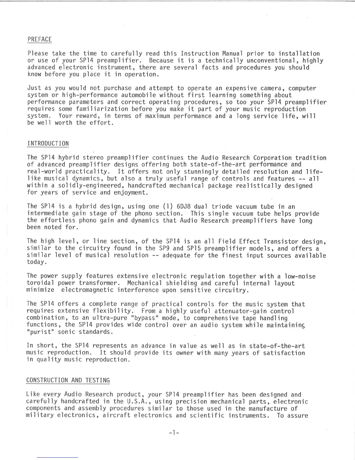 Audio Research SP14 - Preface; Introduction; Construction and Testing