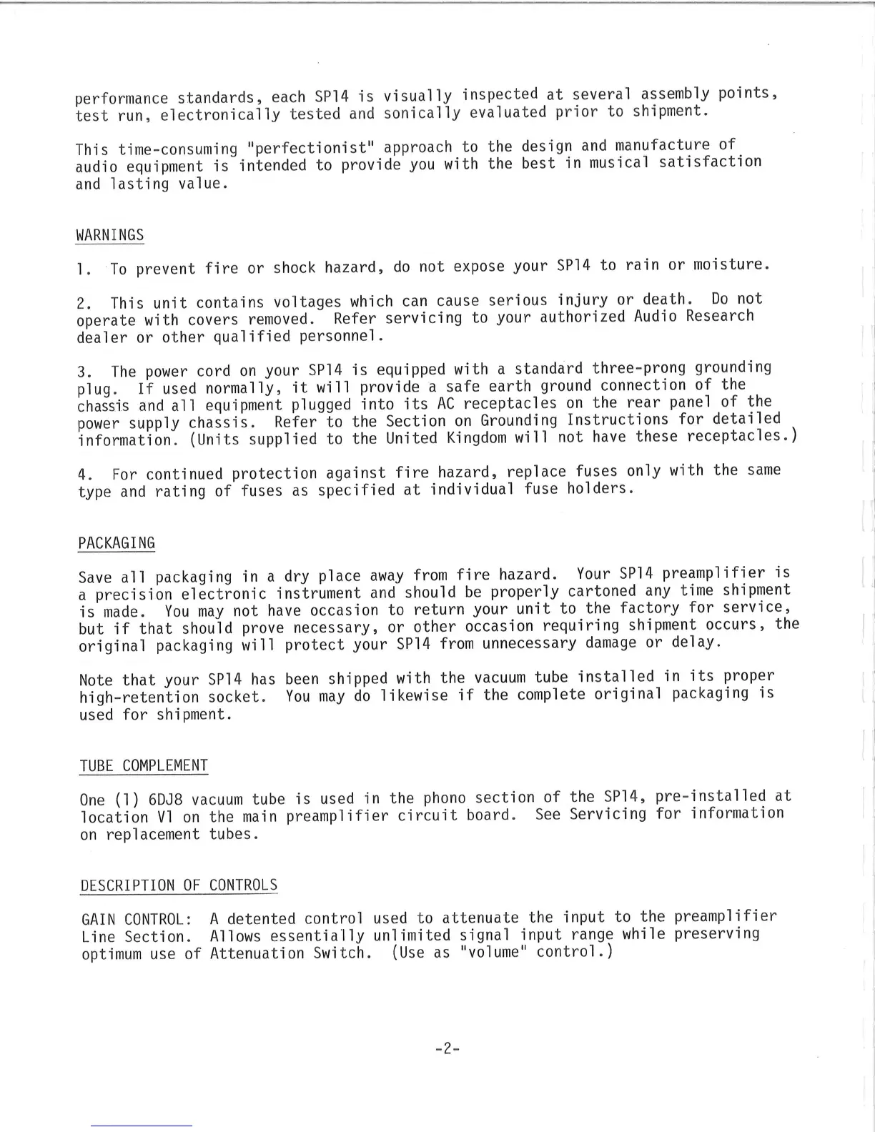 Audio Research SP14 - Warnings and Safety; General Warnings; Packaging and Tube Complement; Description of Controls