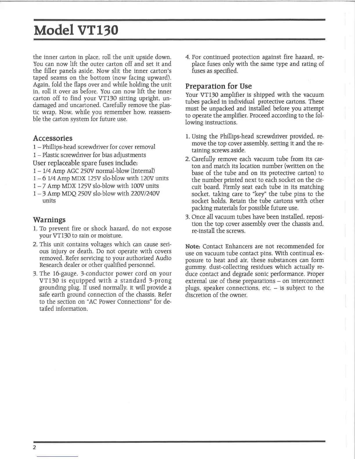 Audio Research VT130 - Accessories; Warnings; Preparation for Use