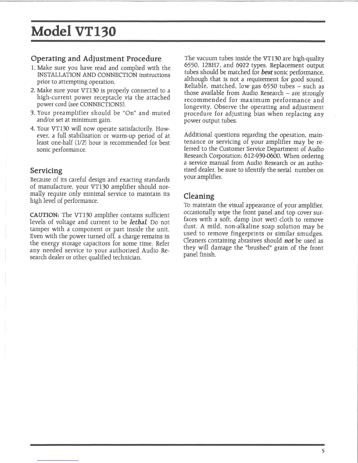 Audio Research VT130 - Operating and Adjustment Procedure; Servicing; Cleaning
