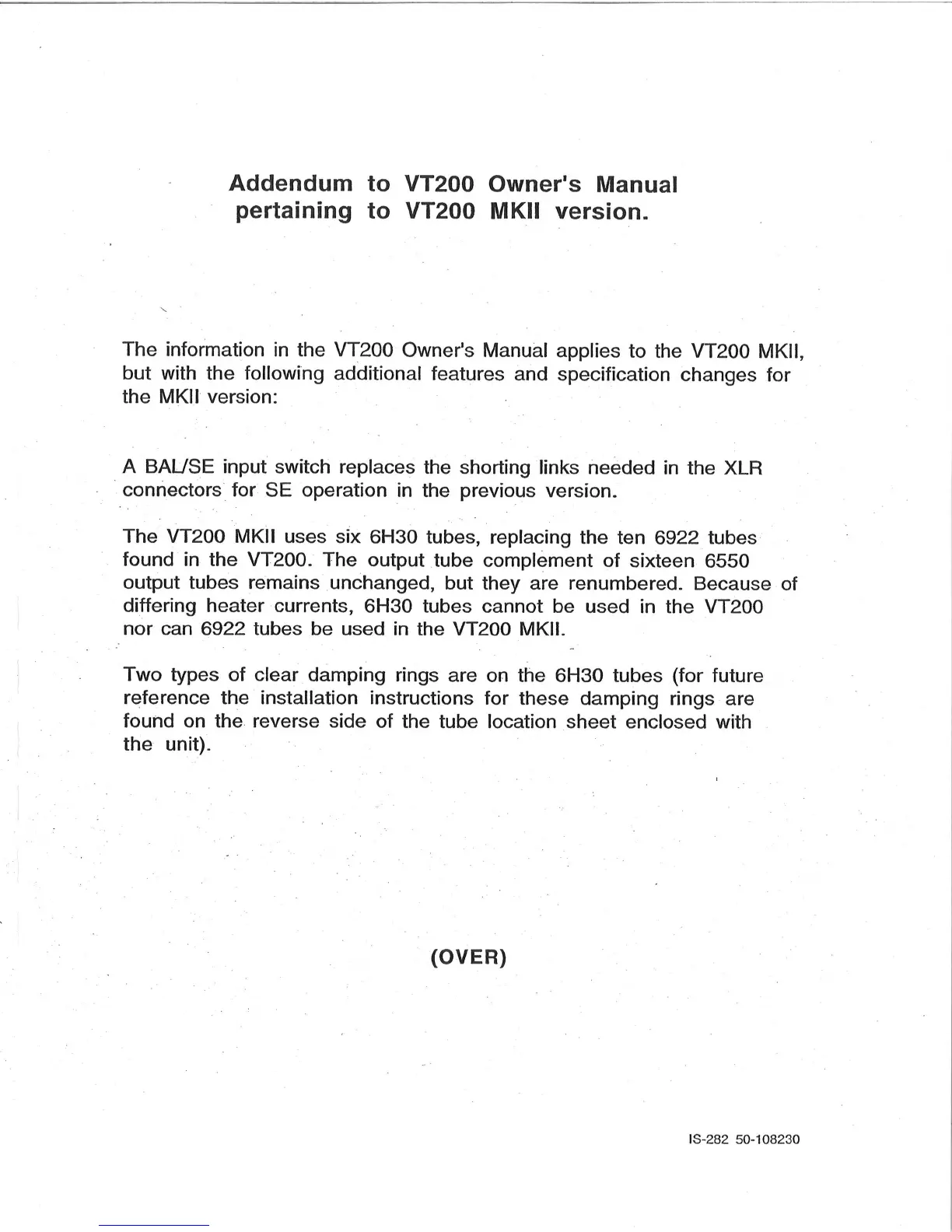 Audio Research VT200 - Addendum: VT200 MKII Version; MKII Version Features and Changes