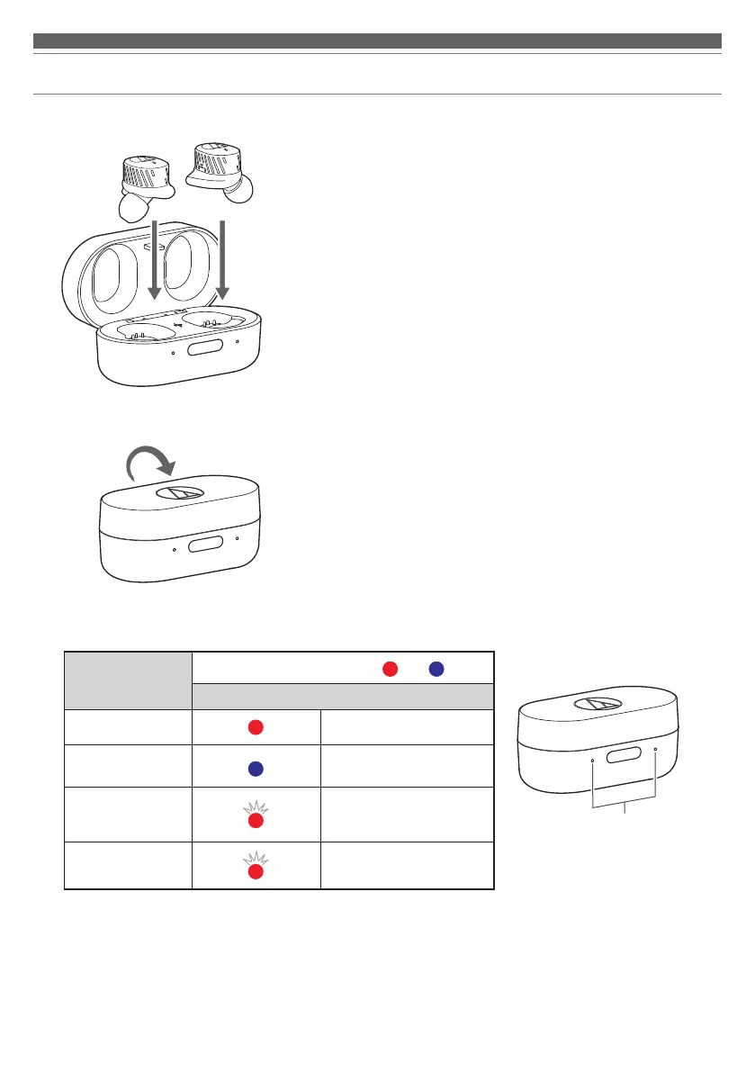 • During charging, the two charging indicator lamps (for the headphones) light at the front of the charging case as