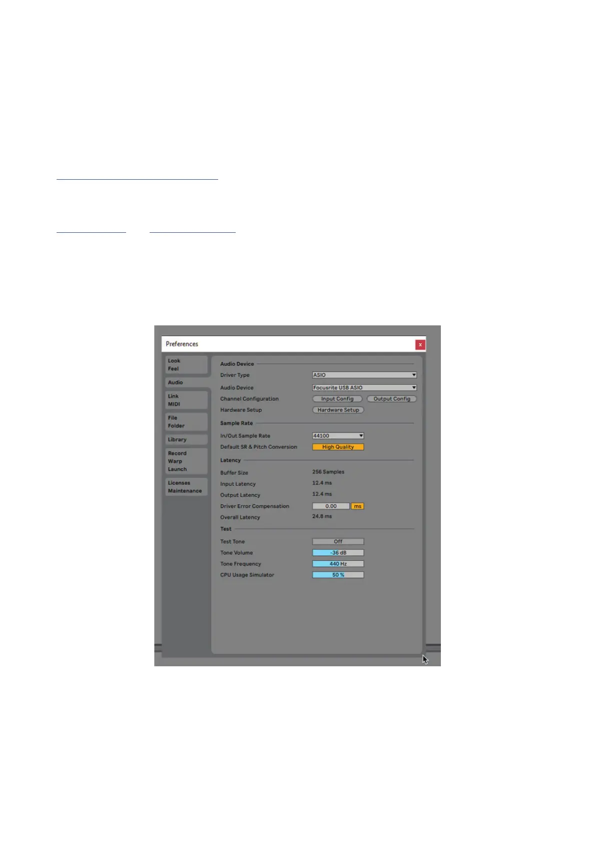 ASIO or Core Audio driver. The example below shows the correct confi guration in the Ableton Live