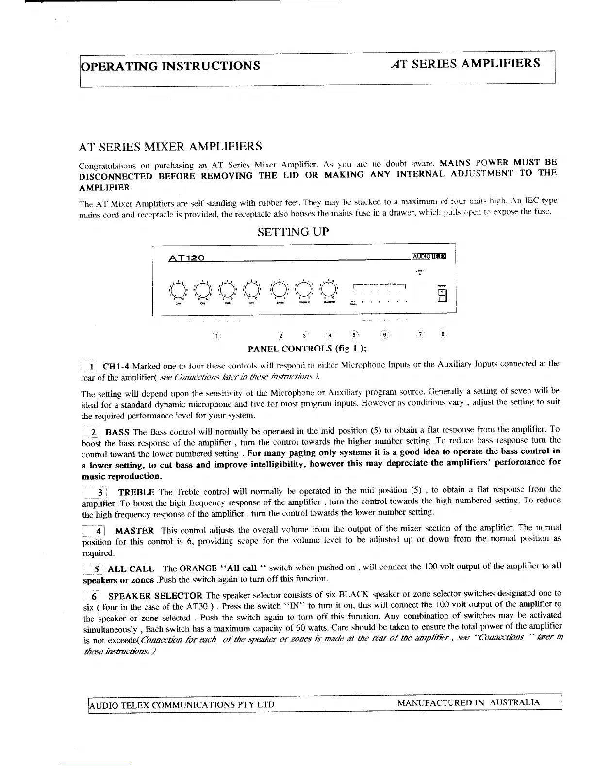 AUDIO TELEX AT - Congratulations on Purchasing an at Series Mixer Amplifier; Setting up; Panel Controls; Bass Control