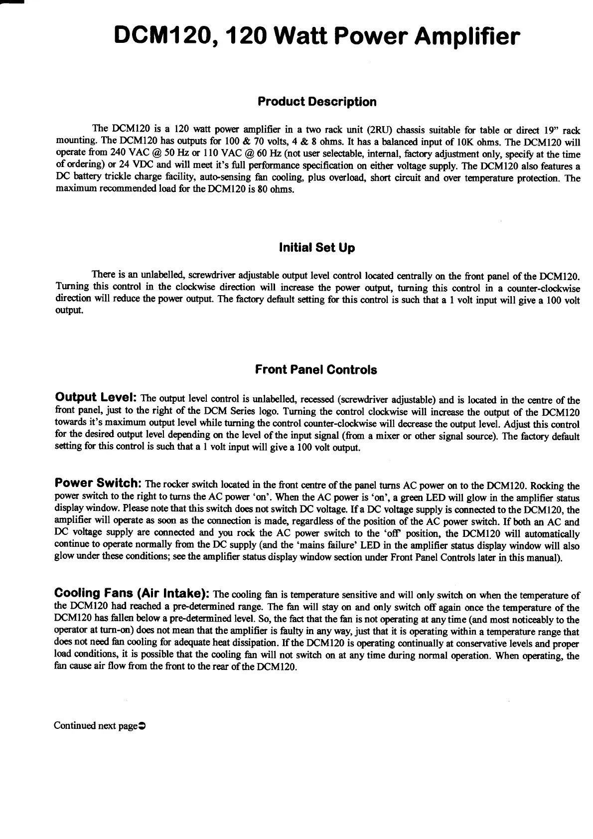 AUDIO TELEX DCM120 - Product Description; Initial Set Up; Front Panel Controls