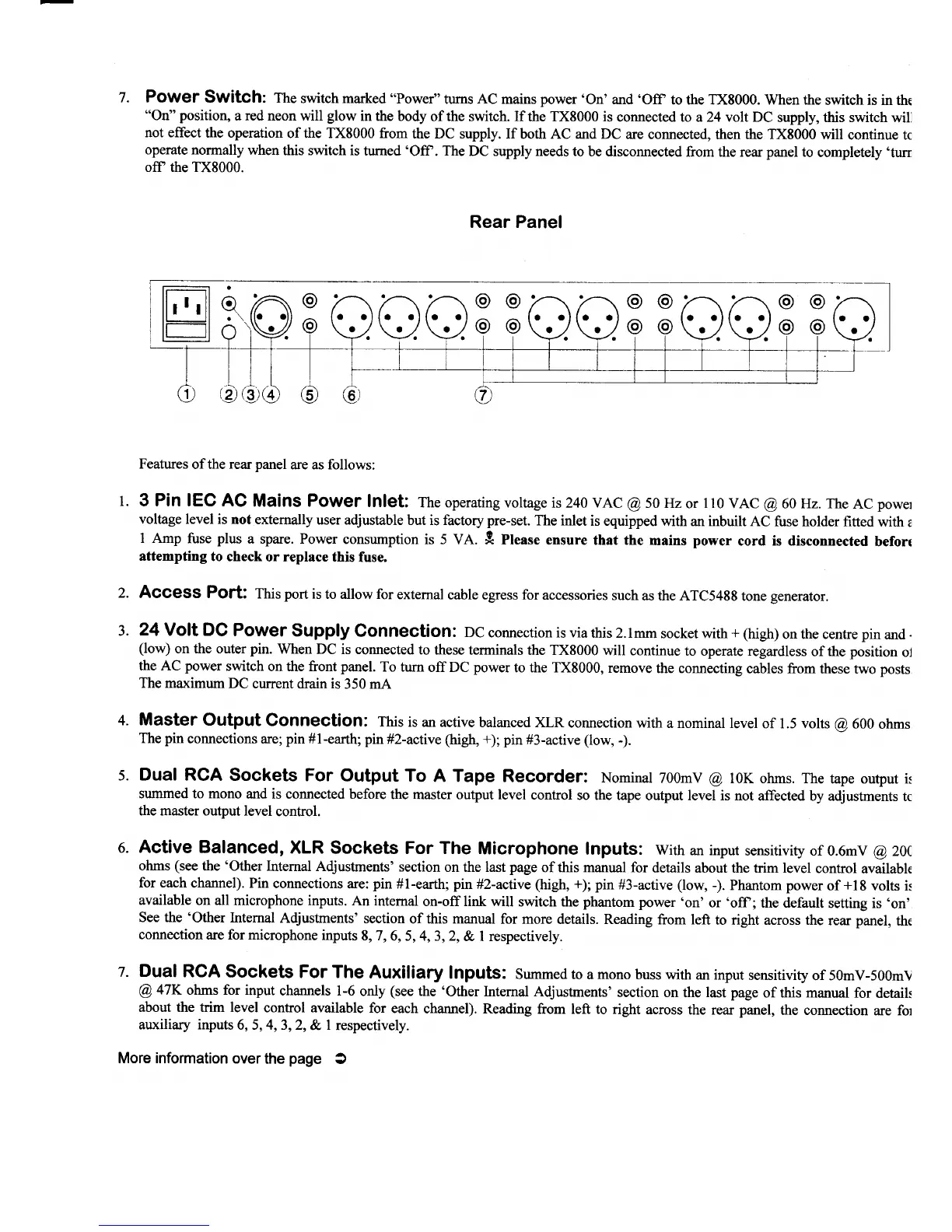 AUDIO TELEX TX8000 - Rear Panel Features; 3 Pin IEC AC Mains Power Inlet; Access Port; 24 Volt DC Power Supply Connection