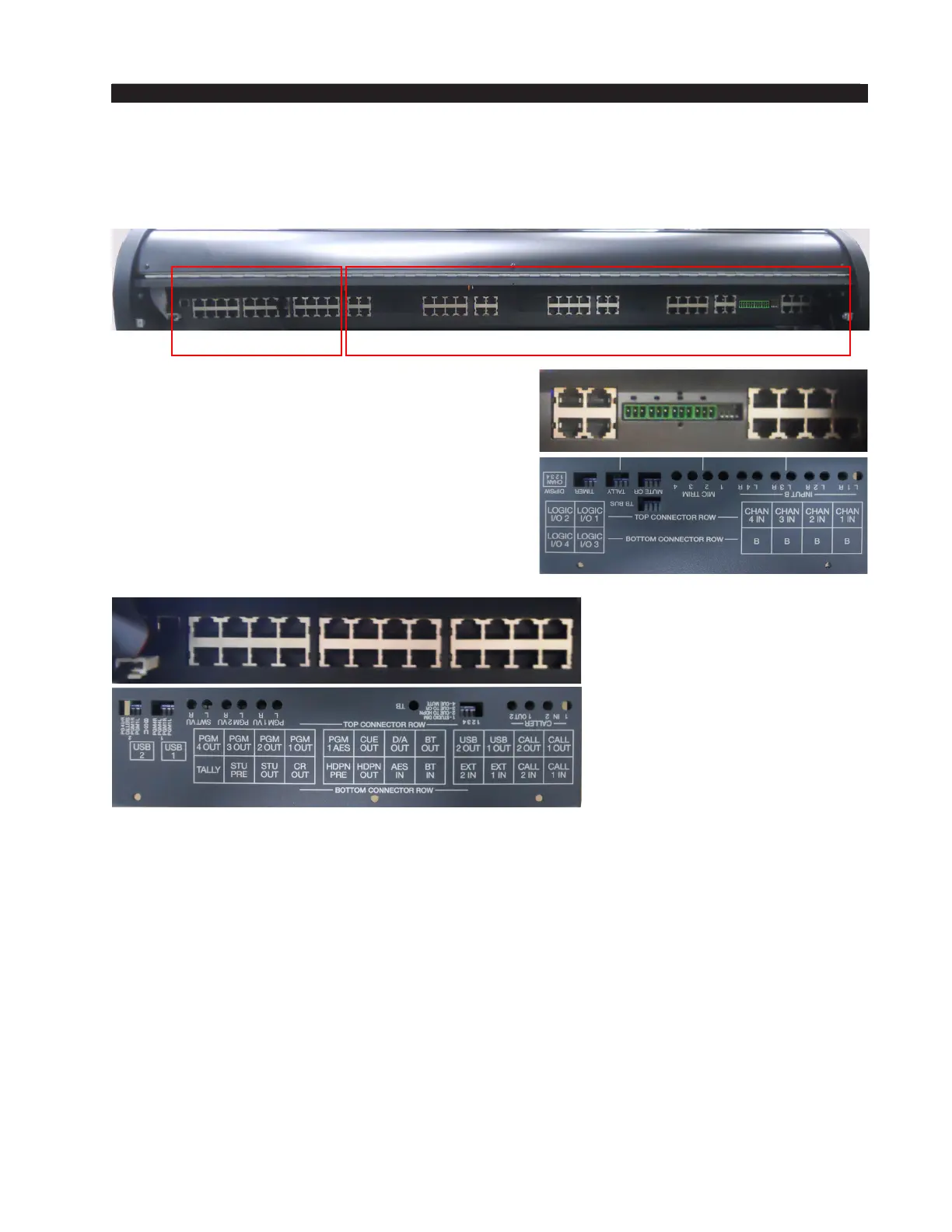 Two RJ-45 CALL 1, 2 OUT are mono line level post fader summed trimmed outputs.