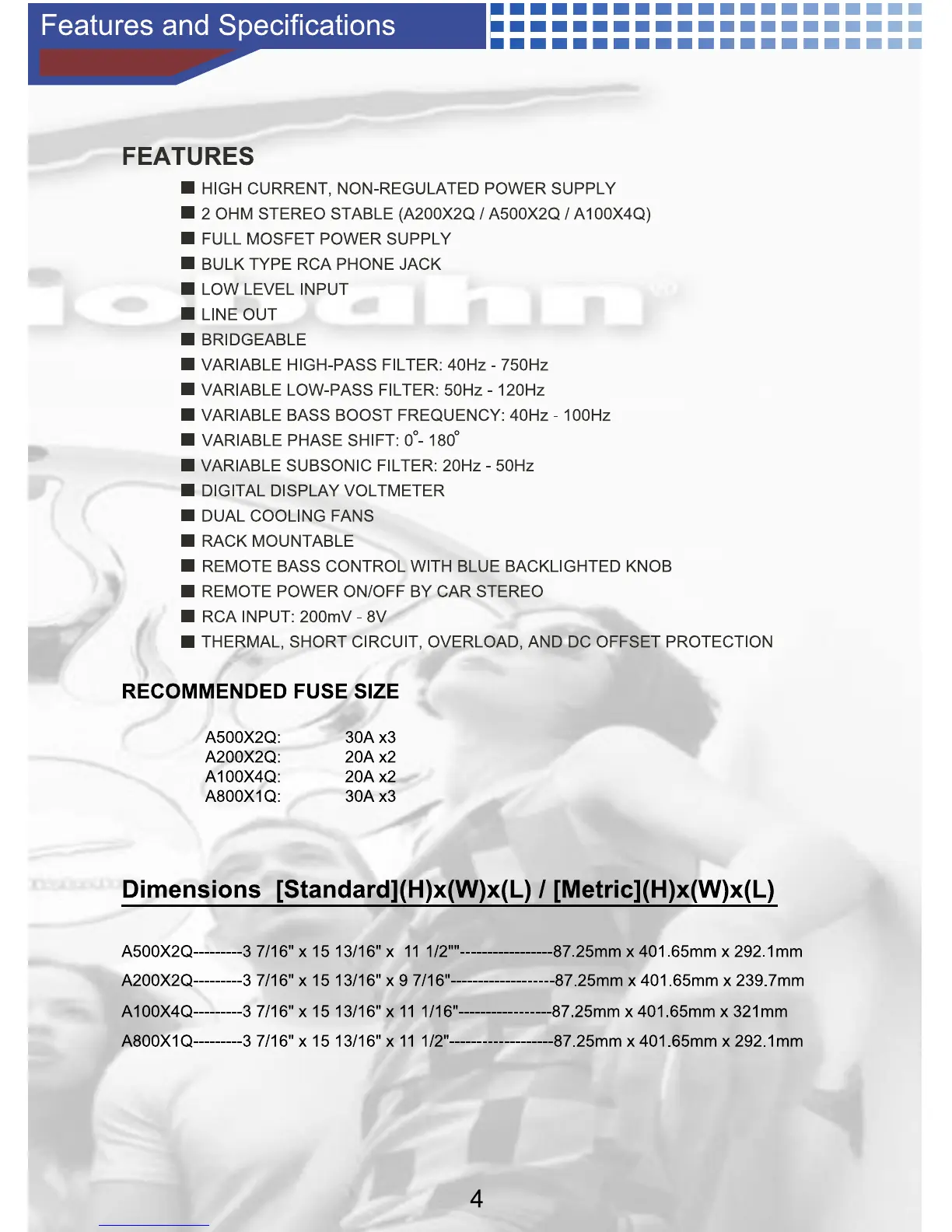 AudioBahn A500X2Q - Features; Recommended Fuse Size; Dimensions